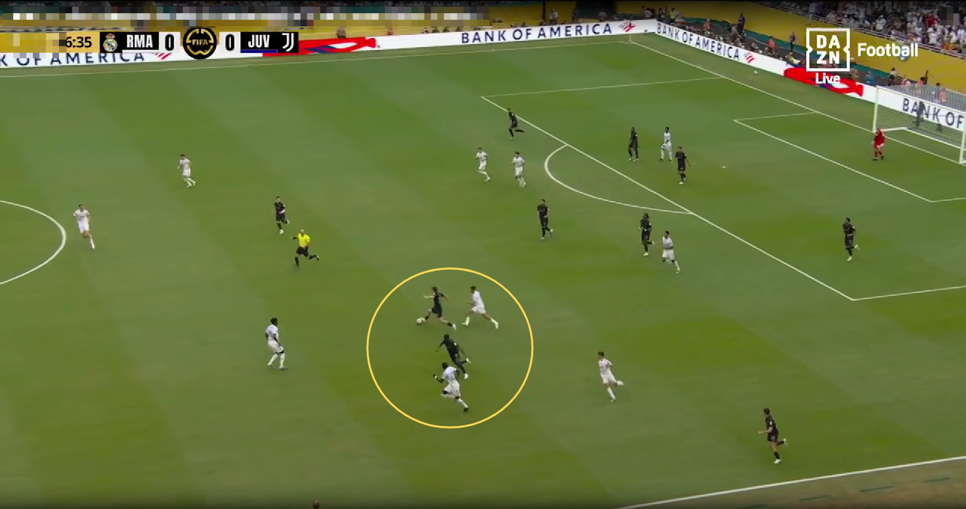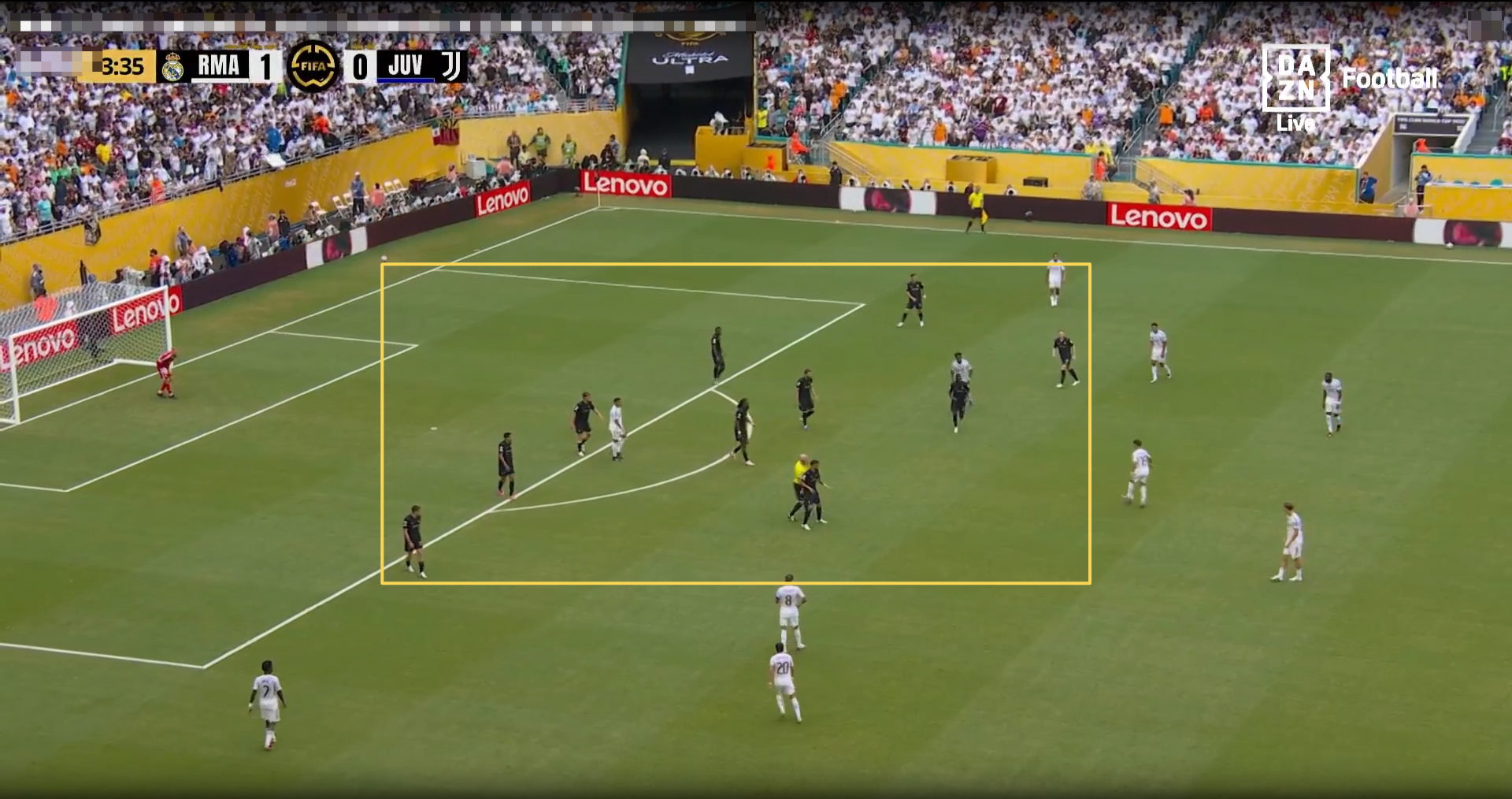 «Ювентус» старался действовать плотно. В некоторых ситуациях благодаря этому между линиями оставалось меньше свободного пространства для игроков «Реала». Из-за этого часто можно было наблюдать ситуацию, когда несколько полузащитников «Мадрида» (особенно Арда Гюлер) опускались к центральным защитникам для помощи в начальной стадии атаки.