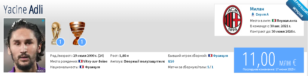 Яссин Адли, может перебраться в московский «Спартак». Как сообщает Иван Карпов, российский клуб близок к соглашению с опорником «Фиорентины». Французу 24 года, контракт у него заканчивается уже 30 июня 2026 года, а значит, ценник будет ниже, на трансфермаркте у игрока стоит сумма в 11.000.000 евро.