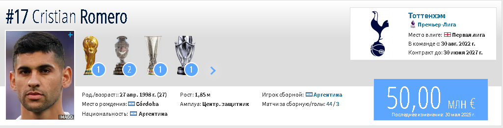 По информации As, «Атлетико» Мадрид готов заплатить 55.000.000 + 15.000.000 евро бонусами за переход Кристиана Ромеро. Игрок на трансфермаркт стоит 50.000.000 евро, а его контракт, действует до 30 июня 2027 года.