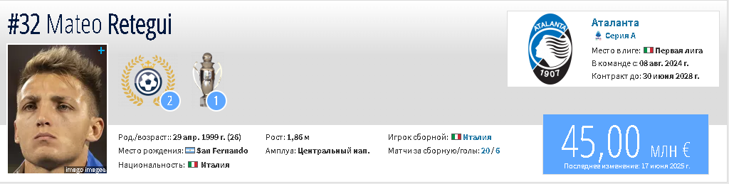 Саудовская Аравия вышла на охоту! Матео Ретеги интересен «Аль-Кадисии», по информации Джанлуки Ди Марцио. 26-летний итальянец в этом году выстрелил, набрав по гол+пас 33 балла и став лучшим бомбардиром итальянской Серии А. Трансферная стоимость игрока поставляет 45.000.000 евро по версии трансфермаркт, а его контракт действует до 30 июня 2028 года.