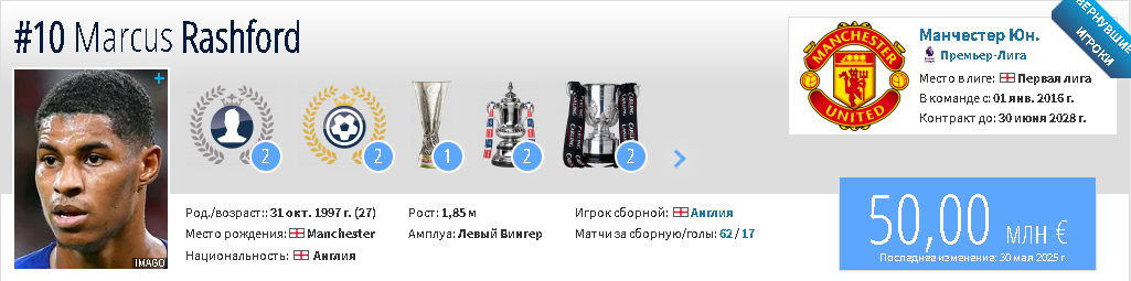 Вероятность перехода Маркуса Рашфорда в «Баварию» выросла с 17%, до 40%. Игроком интересовалась также «Барселона», на данный момент, считается, что «Бавария» фаворит в борьбе за игрока. 27-летний англичанин, стоит по версии трансфермаркта 50.000.000 евро, а его контракт с «Манчестер Юнайтед», заканчивается 30 июня 2028 года.