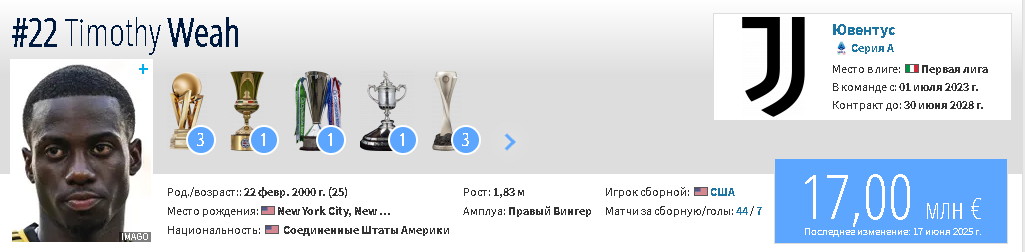 Игрок «Ювентуса» Тимоти Веа, интересен «Марселю», как сообщает инсайдер Фабрицио Романо. Веа — 25 лет, его сумма на трансфермаркт составляет 17.000.000 евро, контракт игрока рассчитан до 30 июня 2028 года.
