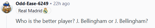 «Ходят слухи, что Джоб Беллингем – это на самом деле Джуд Беллингем, и он играет за два разных клуба. Он получил две желтые карточки, просто чтобы не играть против себя и не быть разоблаченным».