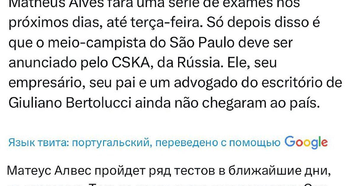 Матеус Алвес пройдёт ряд тестов до вторника. Только после этого ЦСКА объявит о трансфере игрока — Bruno Giufrida