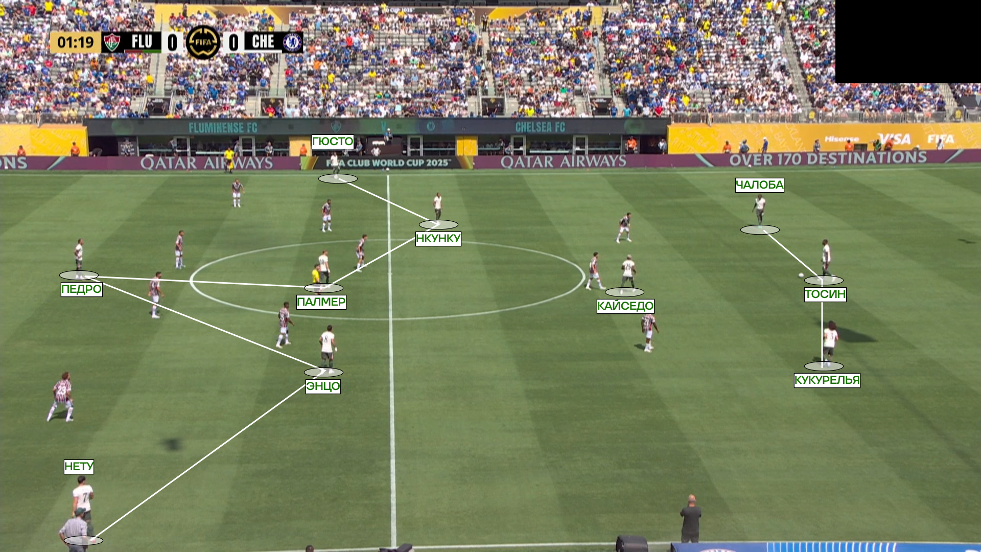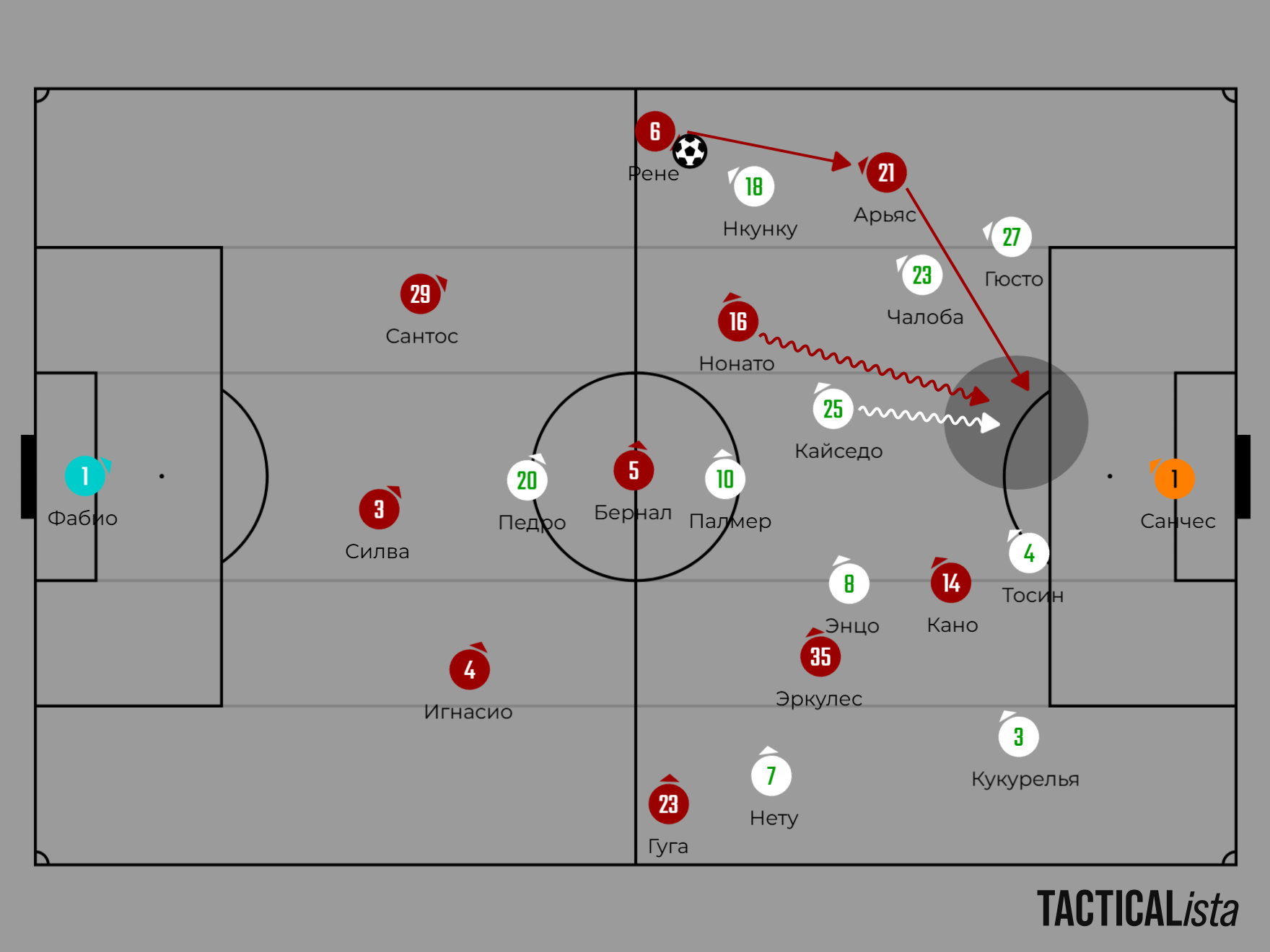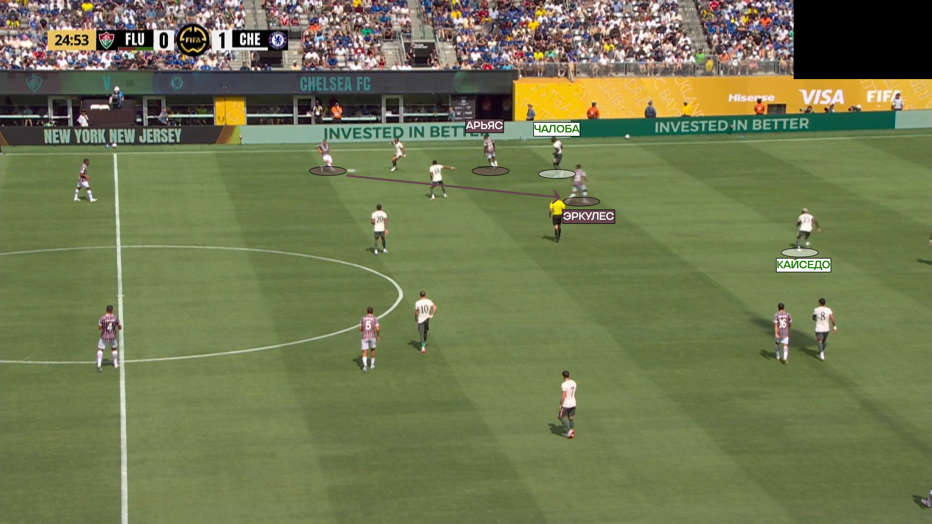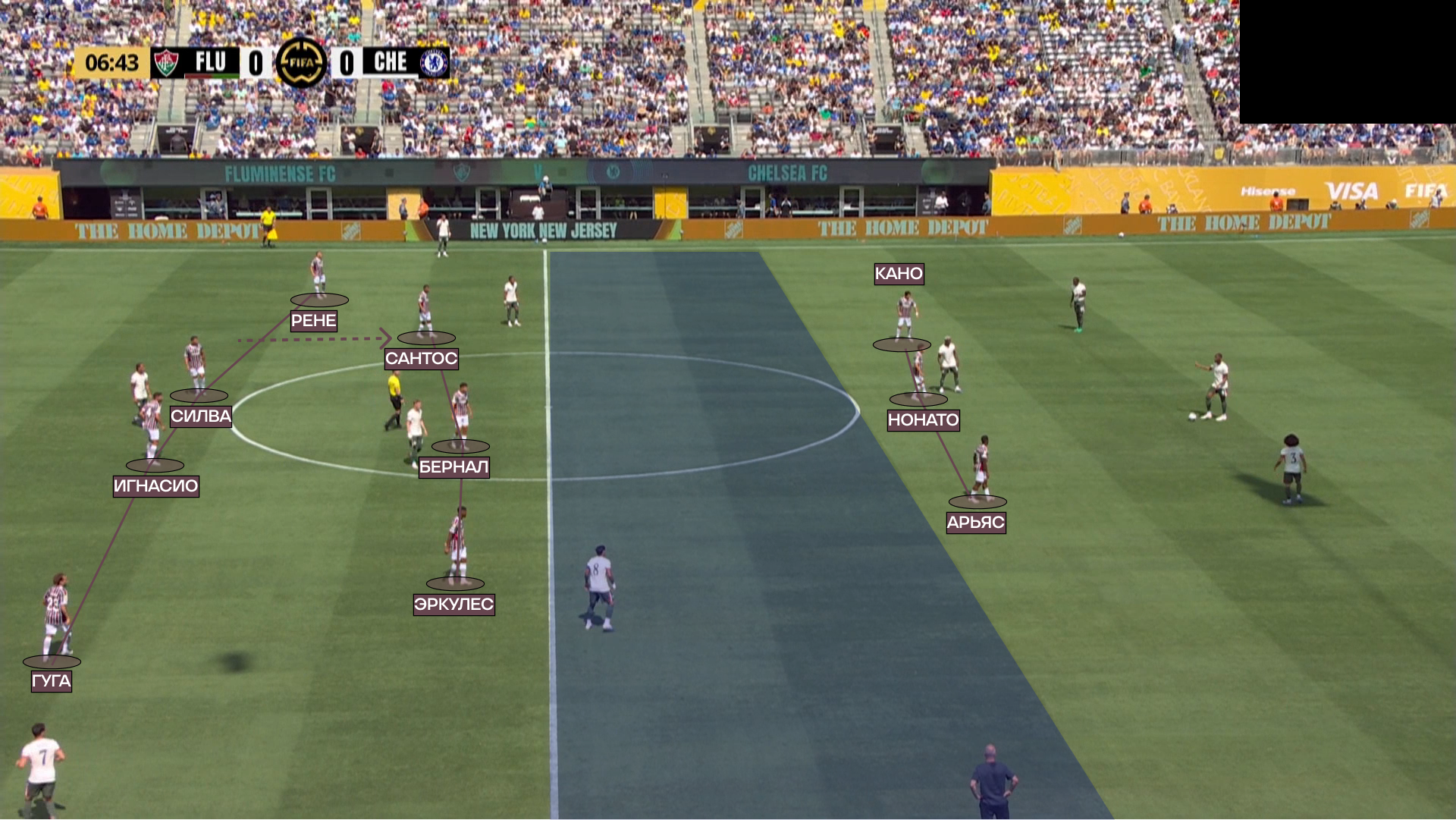 В этом помогала защитная модель «Флуминенсе». Точнее, гибридная схема. В стадии среднего блока 4-3-3 бразильцы активно оказывали давление на тройку защитников и опорника с помощью форвардов Кано и Арьясо. По Кайседо играл Нонато. Но часто (особенно в первом тайме) возникали ситуации, когда Мойзес уходил выше, и Нонато следовал за эквадорцем, тем самым, центр после оставался пустовать, так как «Флу» старался не поднимать защитную линию достаточно высоко. Из-за этого проседала компактность в центре, куда «Челси» и метил передачи.