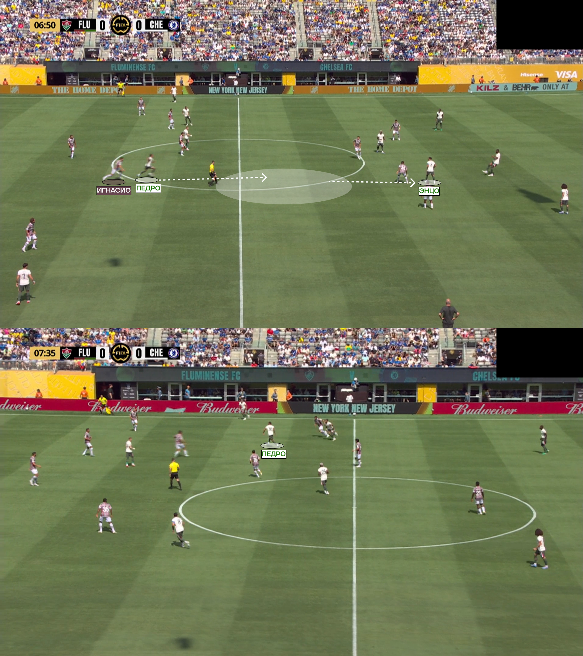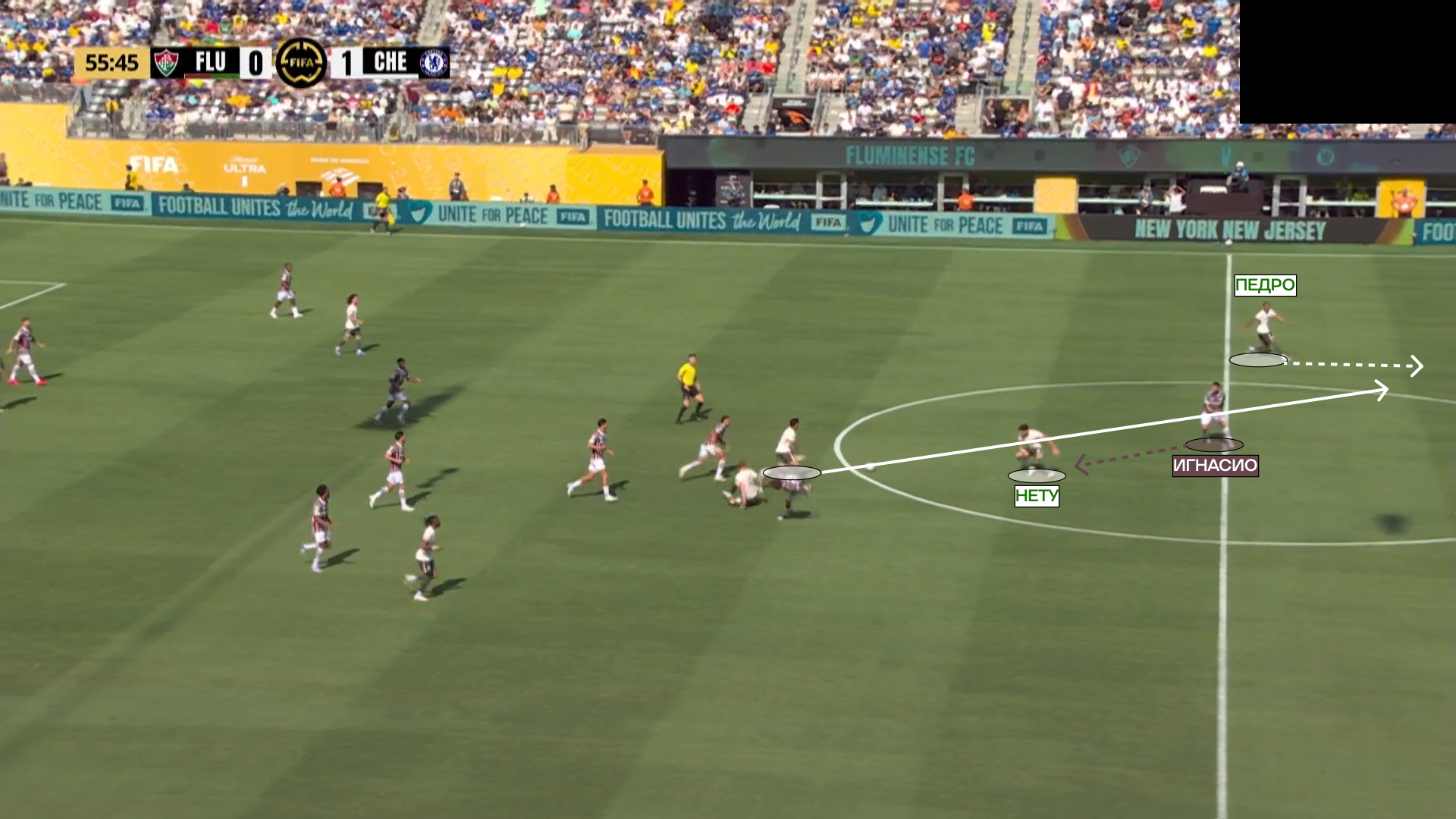 Второй гол подчеркнул рискованный переход «Флуминенсе» на более атакующие рельсы, о которых я рассказывал выше. Что касается Нету, я бы хотел выделить его акцентирование внимания на себе. Игнасио настолько сильно хотел накрыть пас на португальца, что упустил за спиной Педру, как раз на которого и последовала передача от Энцо.