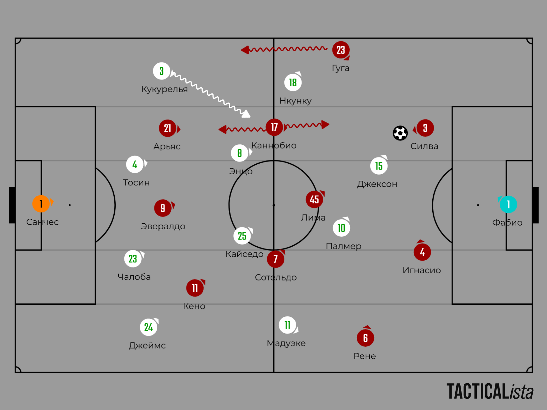 Перегрузы зон достигались благодаря движениям Энцо, Нкунку и Палмера. Плюсы такой тройки в полузащите – один игрок в центре способен поочередно подключаться к оба полуфланга, на пару с вингером перегружая эту часть поля.