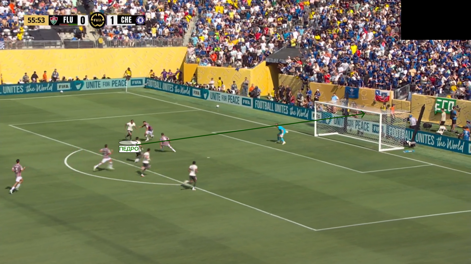 Важно, как Жоао уходил в глубину. Это не просто рывки, а игра на свободном пространстве. Например, Энцо Фернандес опускался на уровень к Кайседо, уводя за собой опекуна. В результате открывалась та самая зона в центре, куда и опускался Педро. Часто Жоао выдергивал за собой центрального защитника, что помогало «Челси» уменьшать численность защитного блока бразильцев.