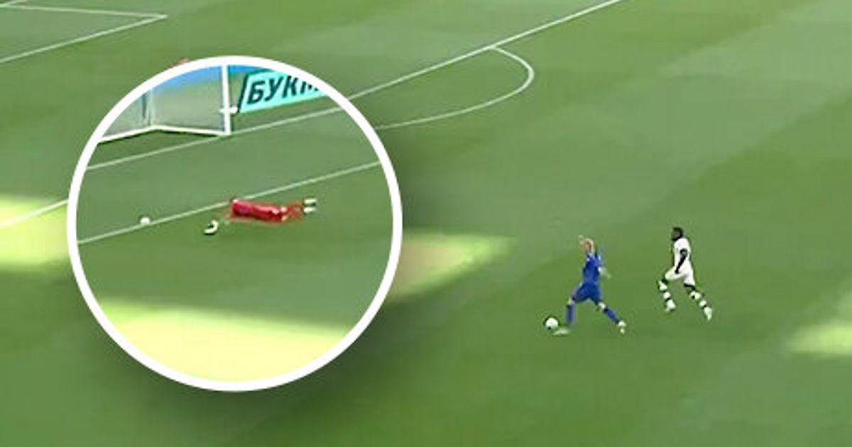 Идеально отправил мяч в ворота с нерабочей левой ноги. Обводящий удар (пас) в угол.