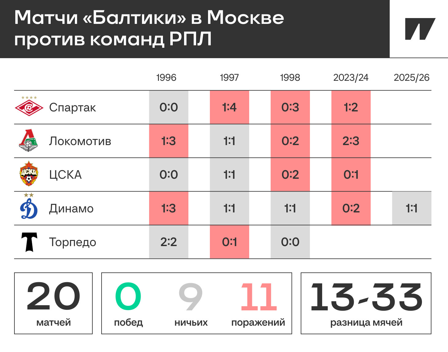 Учтены четыре полных сезона и игра первого тура с «Динамо». Мрачная статистика для «Балтики» – с победой не уезжали до сих пор.