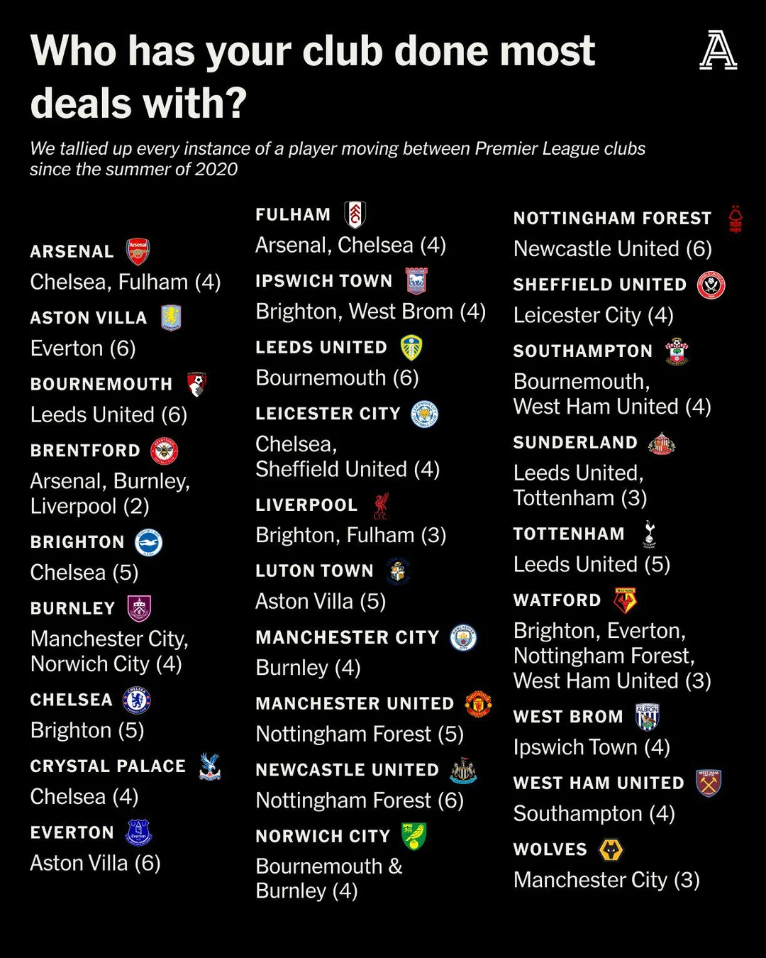 Перед стартом нового сезона The Athletic выкатил масштабное исследование по АПЛ. Одну из график они посвятили трансферному взаимодействию между клубами внутри лиги.
