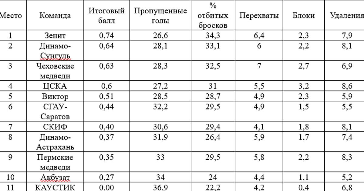 Исследование проведено на основе статистических данных, опубликованных на официальном сайте Федерации гандбола России. Анализу подверглись данные по 11 командам гандбольной «Суперлиги» за 16 матчей. Для оценки эффективности защиты использовалось 5 показателей, к каждому из них мы назначили свой вес, который определяется процентами. Сумма всех показателей должна быть равна 100%.