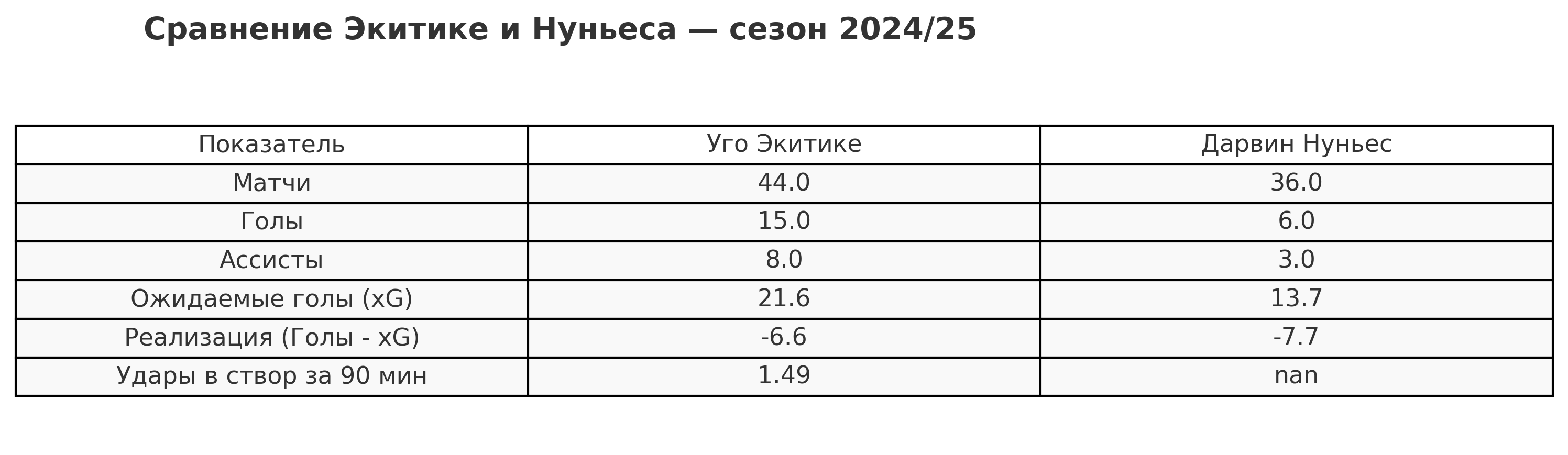 Показатель Уго Экитике (2024/25) Дарвин Нуньес (2024/25)