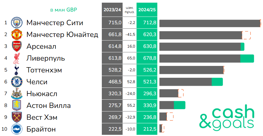 Все перечисленные выше клубы по итогам сезона 2023/24 вошли в топ-10 АПЛ по величине операционного дохода — то есть заработали больше остальных на билетах, спонсорстве, коммерческой активности и турнирных призовых. Можно оценить, как выступления клубов повлияли на этот показатель.