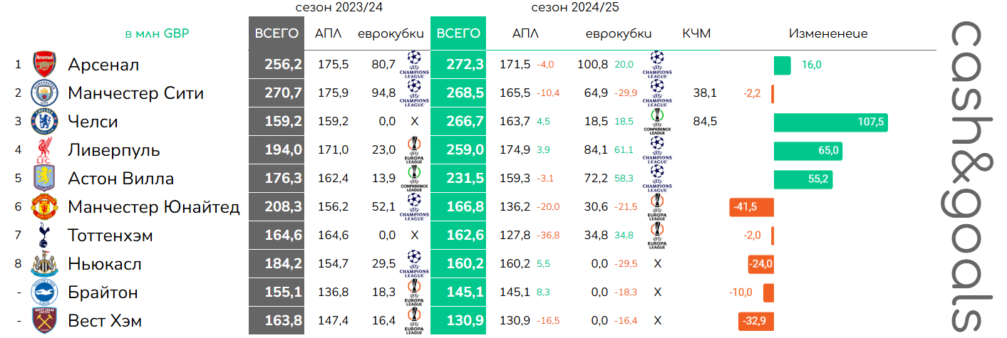 «Ньюкасл», «Брайтон» и «Вест Хэм» остались без еврокубков, что привело к снижению доходов. Однако первые два клуба улучшили позиции в АПЛ, тогда как «молотобойцы» просели по всем направлениям.