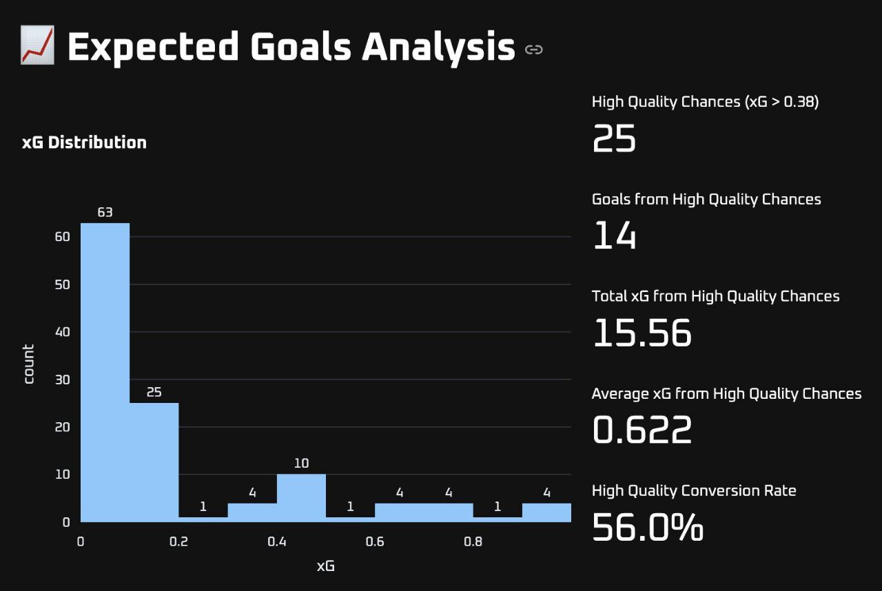 По сухим цифрам она была слабой в прошедшем сезоне: не добрал 6 голов в Бундеслиге. Однако цифры не дают полную картину. Большинство ударов Юго имеют маленький xG, по голевым моментам у него всё неплохо. Т.е. да, Экитике определённо андерперформил в реализации, но это не так ужасно, как некоторые считают.