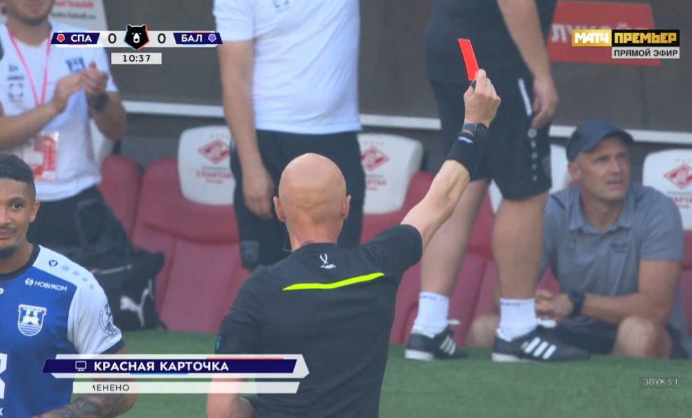 У «Балтики» прошел заброс по флангу, а Маркиньос завалил убегавшего к воротам соперника. Карасев без раздумий показал предупреждение, которое стало для спартаковца вторым. Первую желтую Маркиньос получил в моменте с отмененным голом – за разговоры с арбитром.