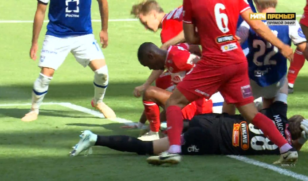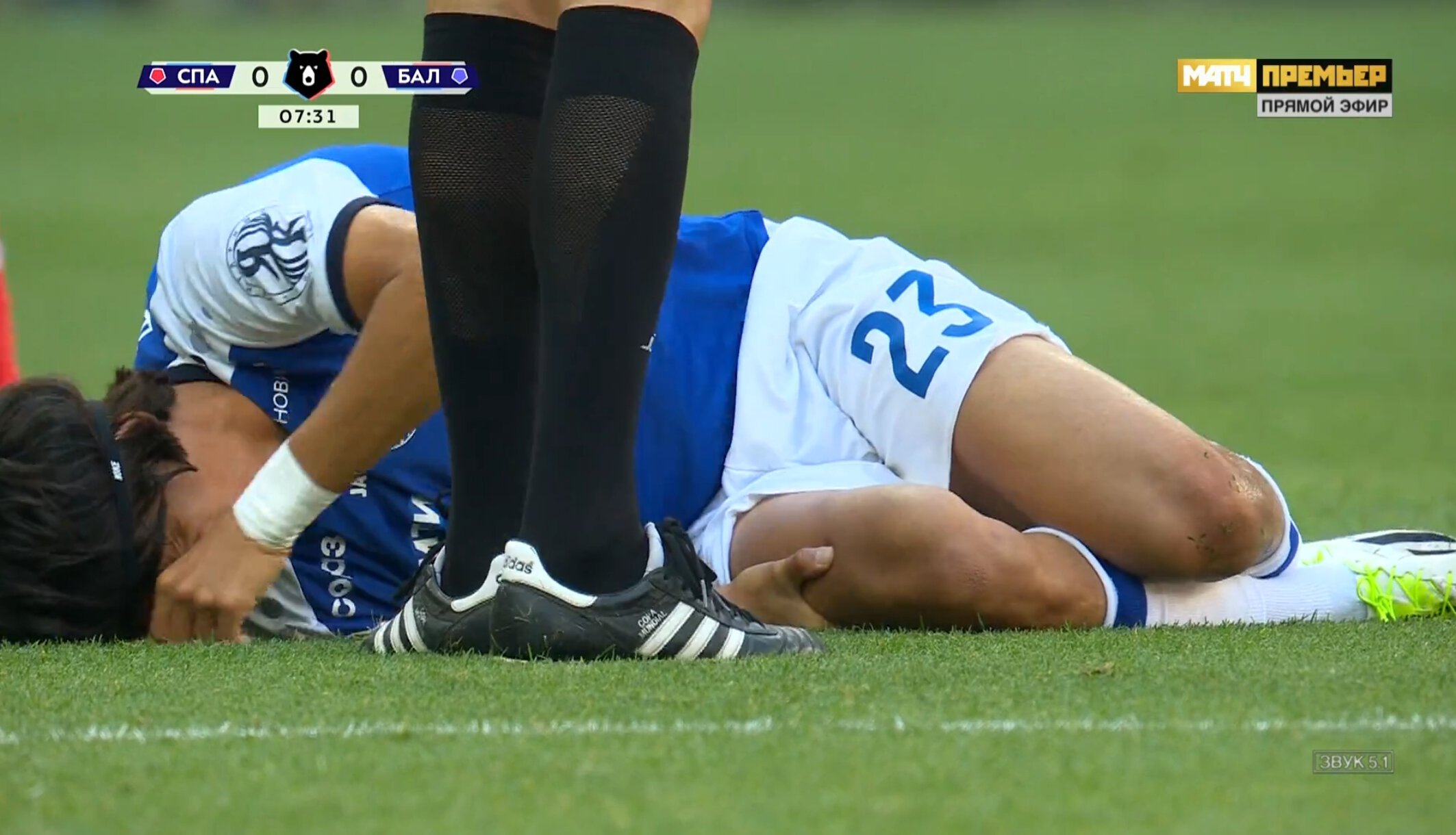 Нападающий «Спартака» потянулся за передачей Даниила Денисова, но не успел – и получилось, что ногой влетел в бедро и потом воткнулся под колено защитнику «Балтики».