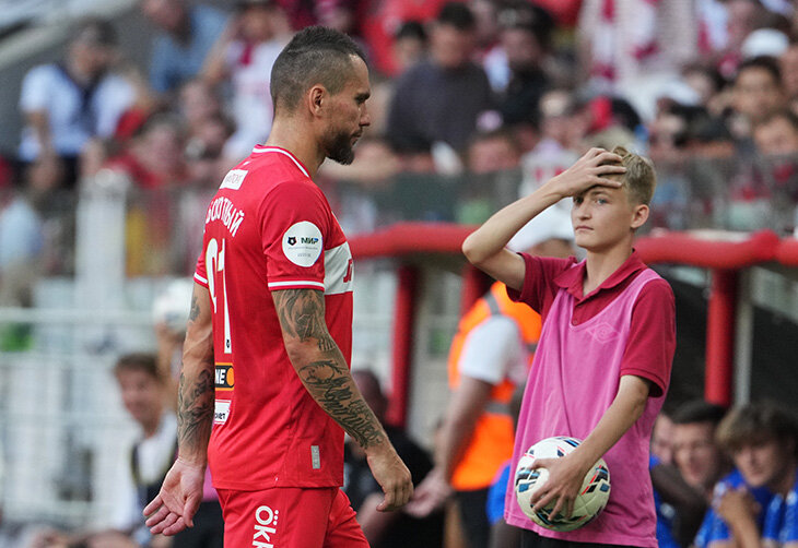 Уже на 10-й минуте домашнего матча против «Балтики» Антона Заболотного удалили за удар по ноге Мингияна Бевеева.