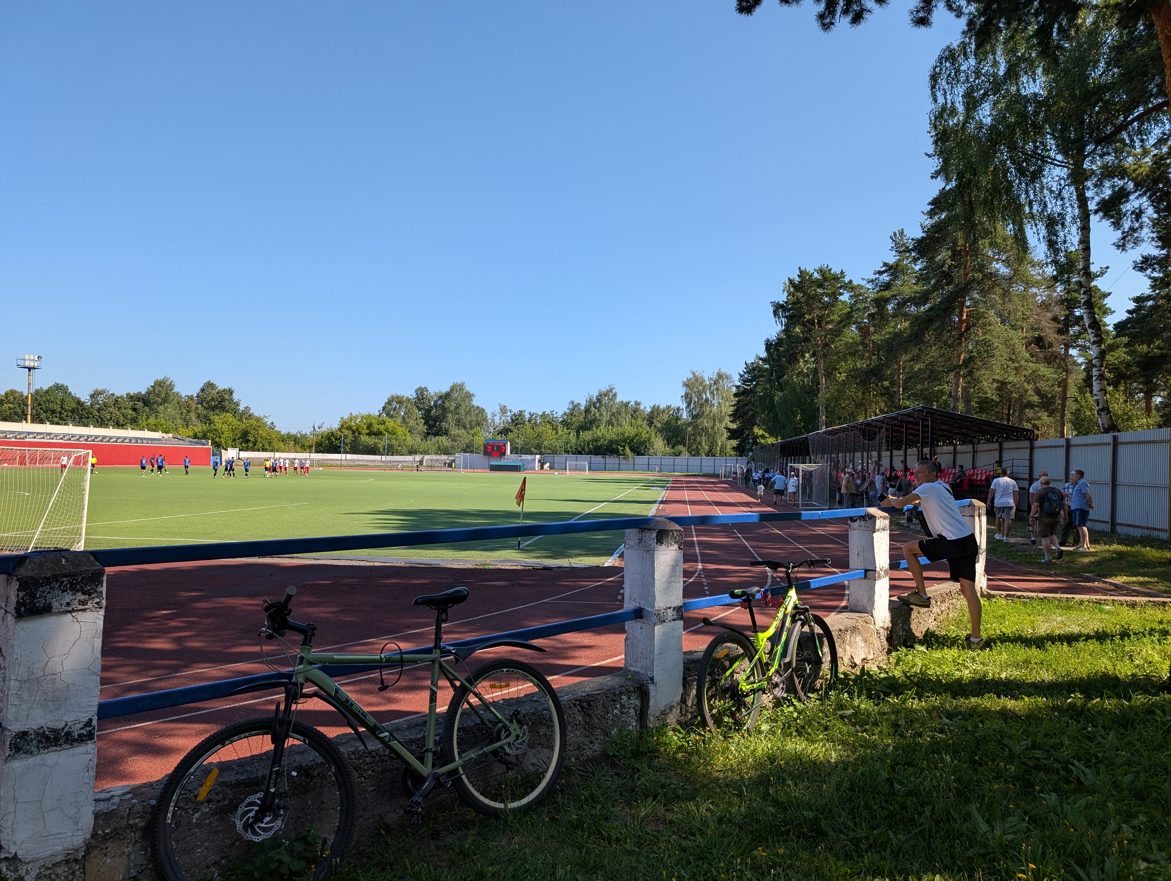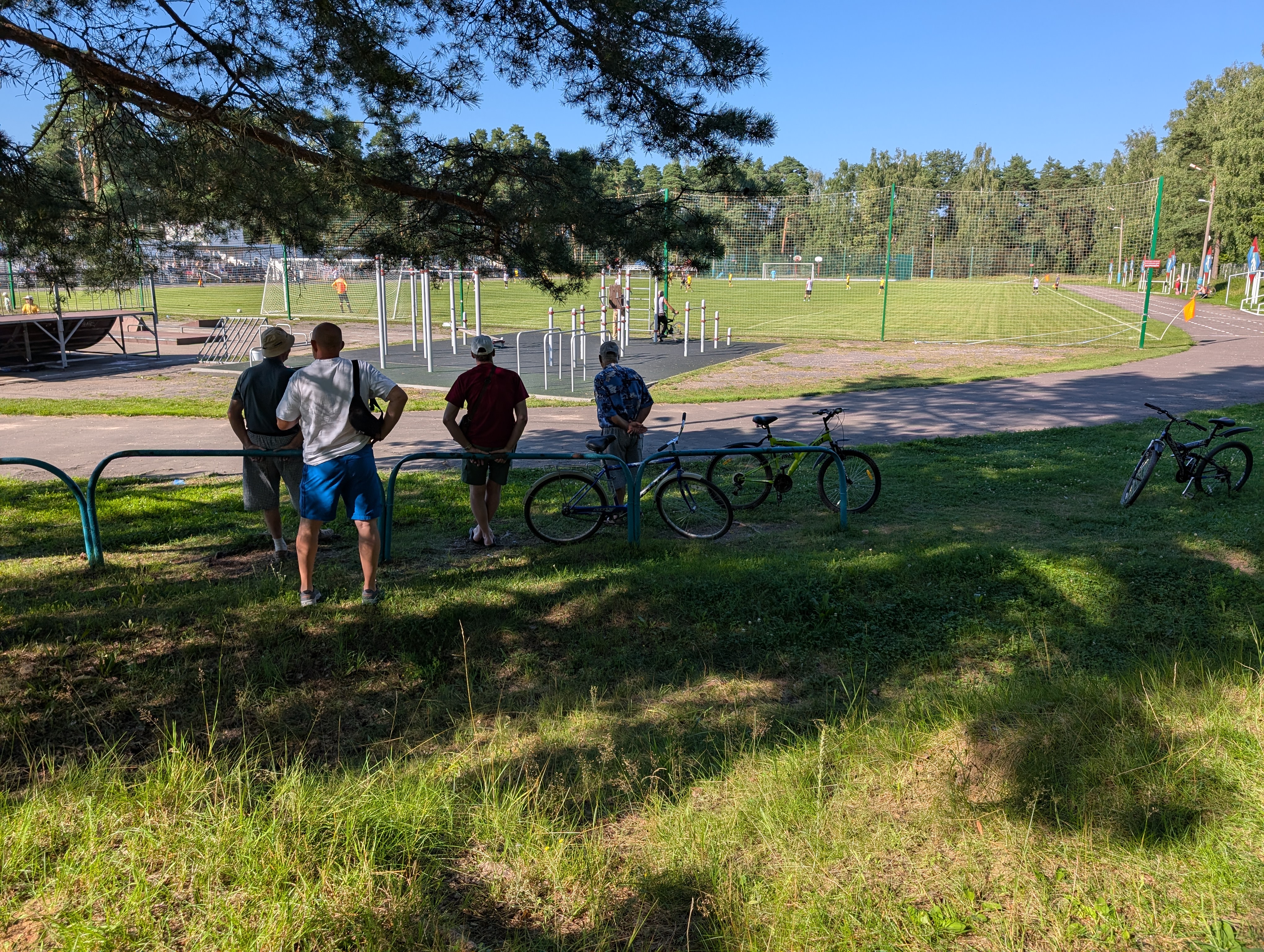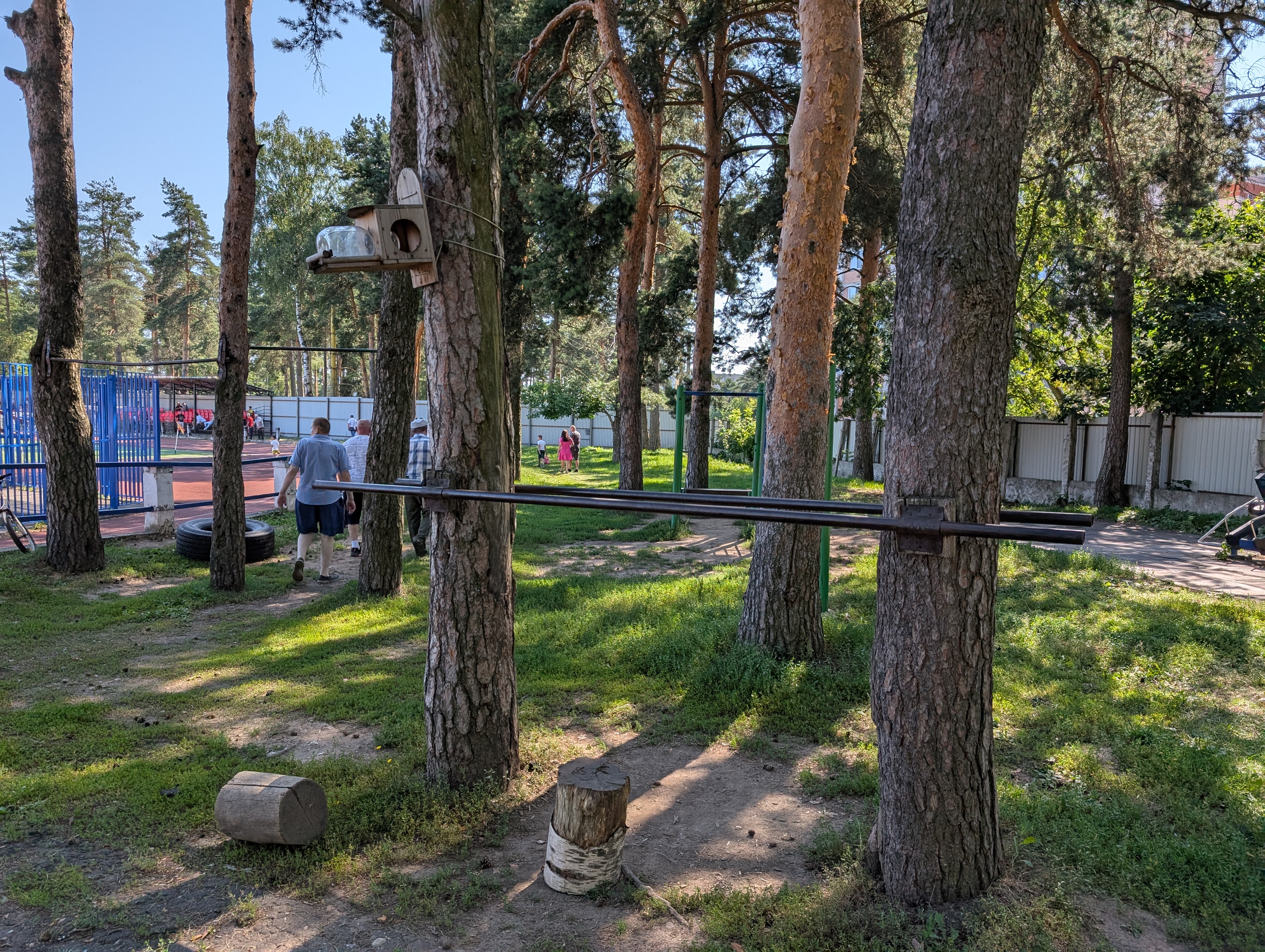 Возле стадиона растут сосны, а в них вмонтированы брусья. Топово выглядит👍