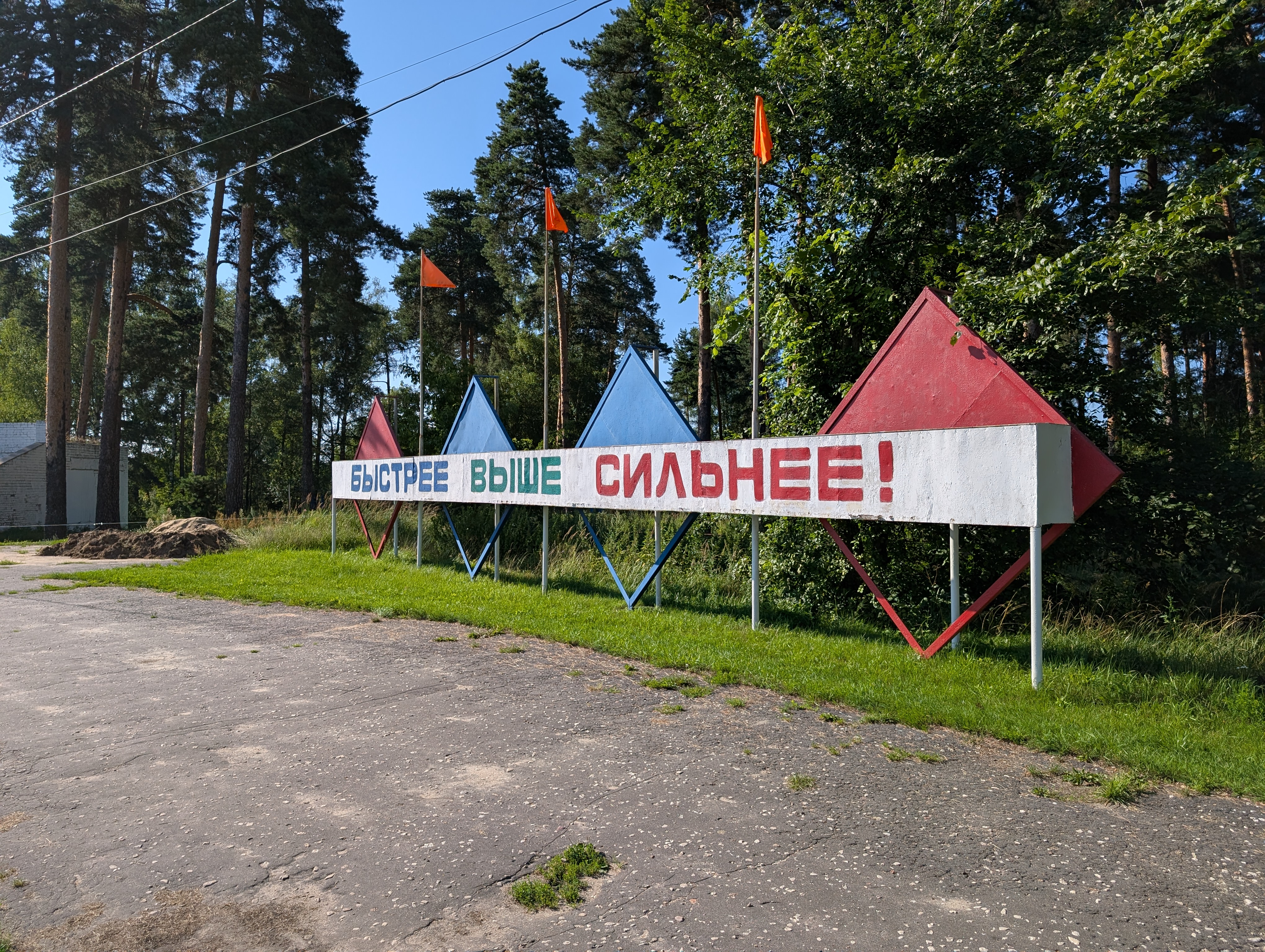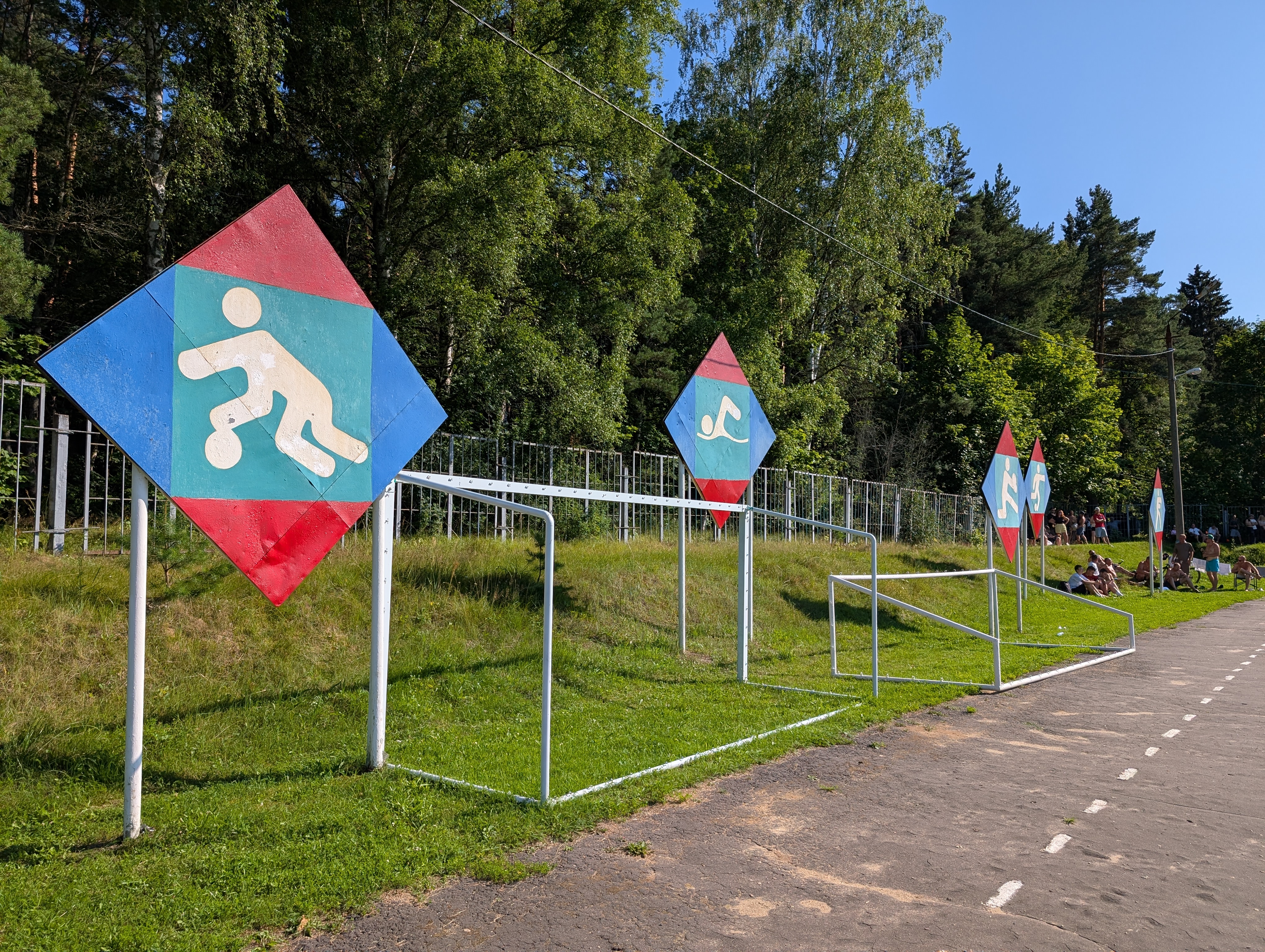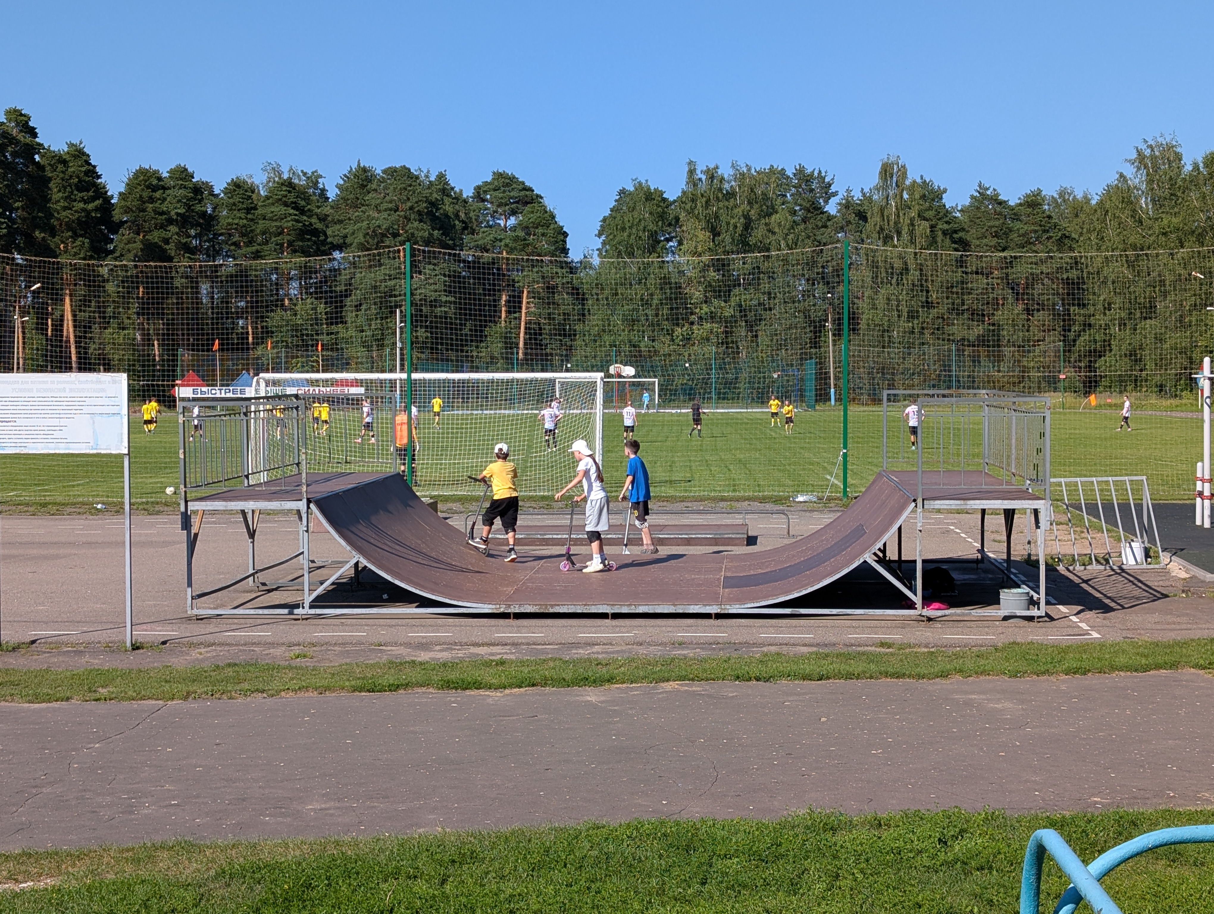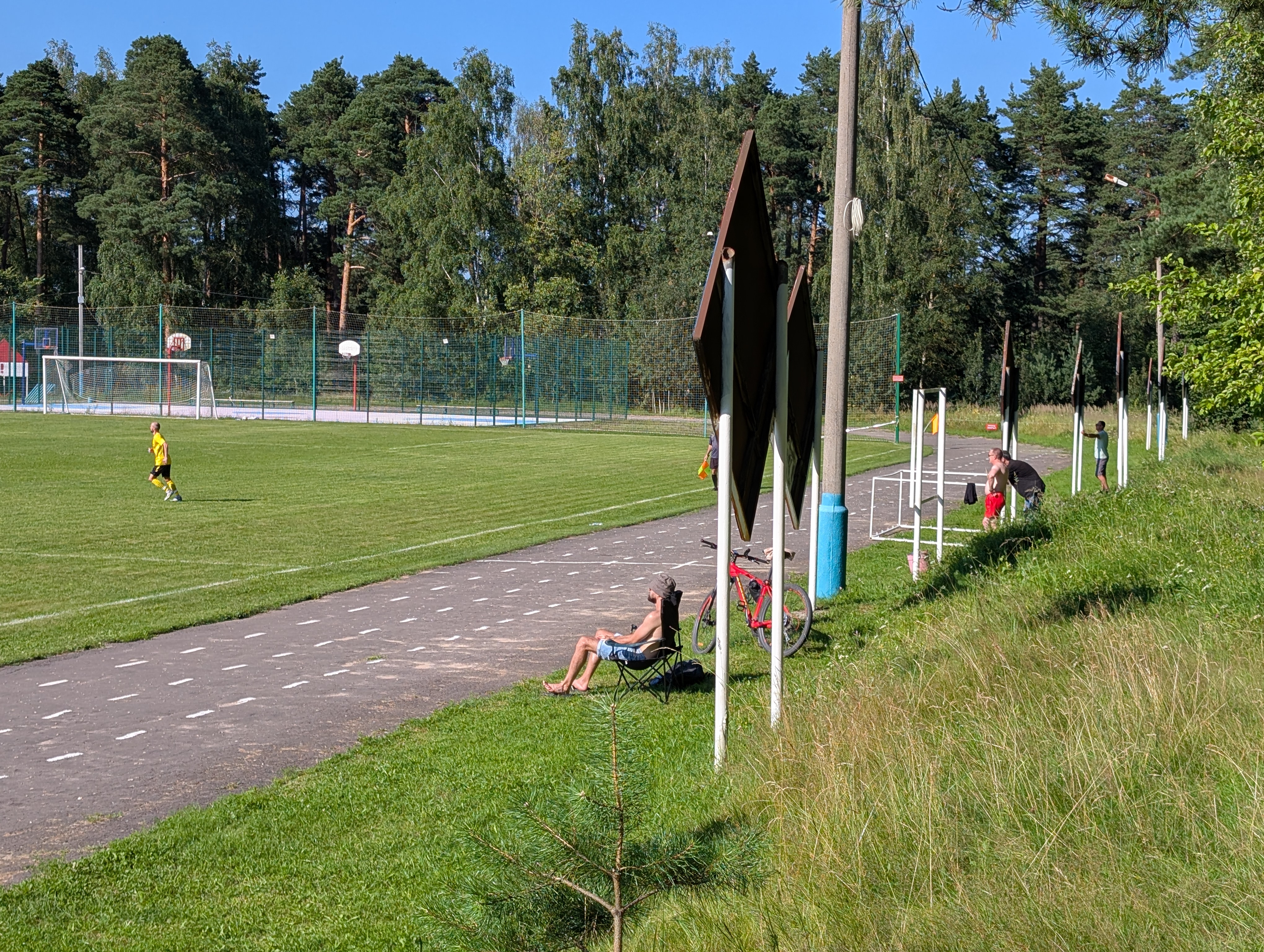 Возле стадиона растут сосны, а в них вмонтированы брусья. Топово выглядит👍