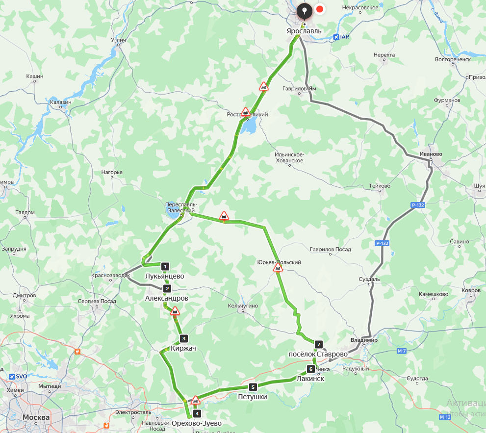 Итак, последняя суббота июля. Зачем-то проснулся в семь утра🙄 Первый субботний матч в Александрове стартует в три, время в пути три с лишним часа, поедем не спеша. Будет время не торопясь посмотреть местные красоты. Общий маршрут на выходные ниже. Расстояние – 620 км., время в пути – 11,5 часов.