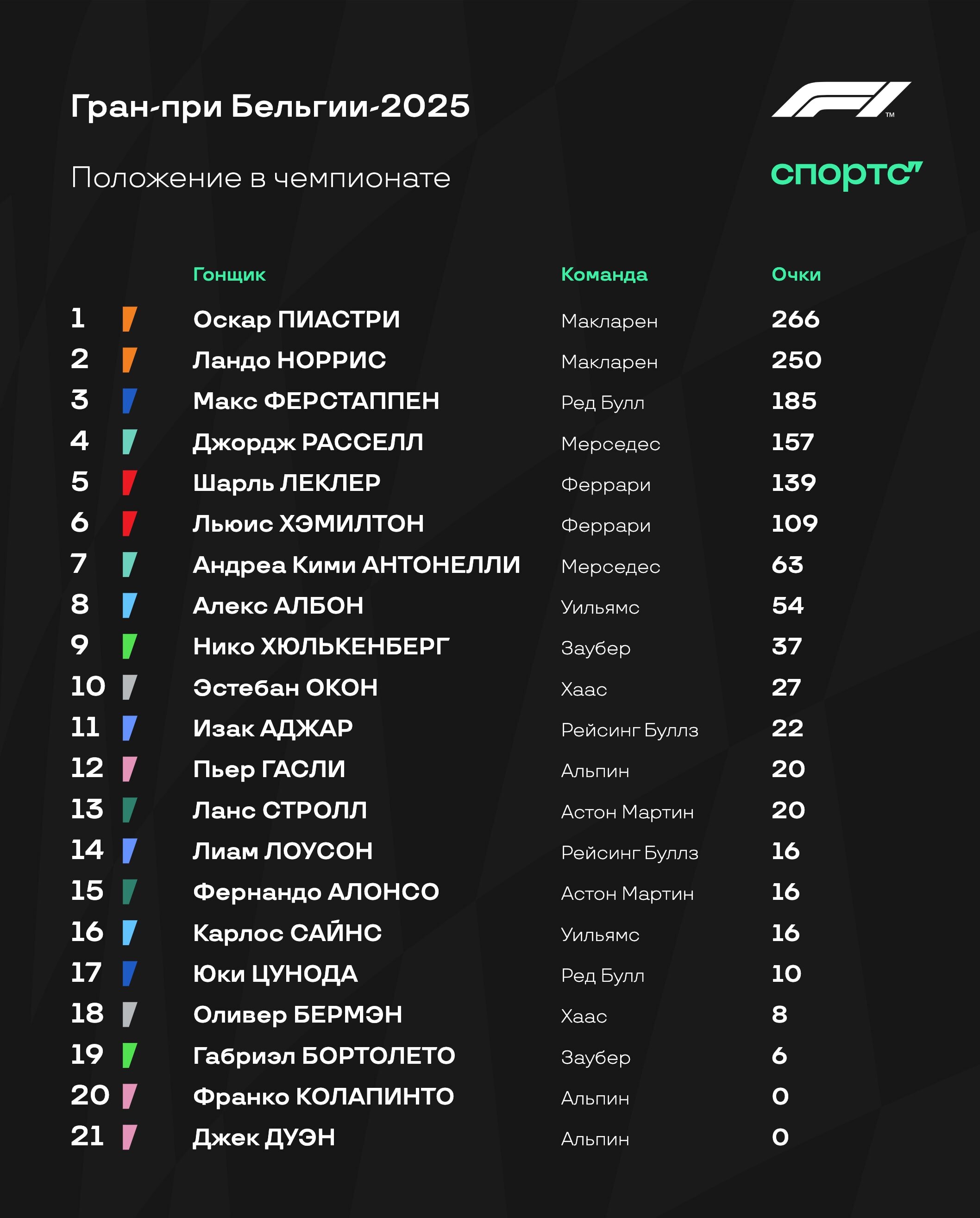 Смотрим на реакцию букмекеров после 13-го этапа. Серия ошибок уничтожила планы Норриса на победу в Бельгии и слегка снизила его шансы на титул – с 43% до 39%. Пиастри же отрывается не только в личном зачете, но и в котировках – вероятность чемпионства взлетела с 60% до 68%.