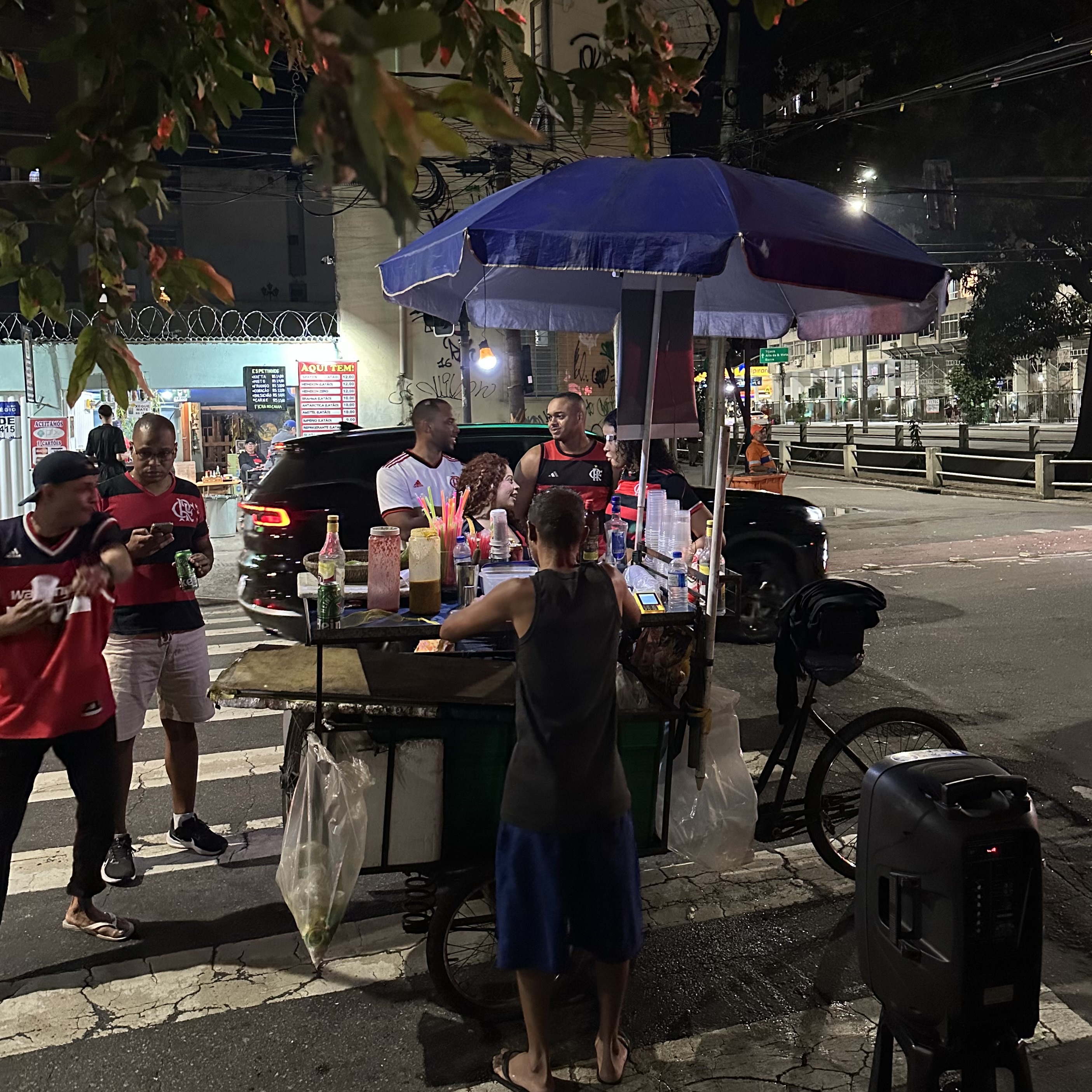 Вокруг стадиона продавали различные закуски: шашлычки, гамбургеры и снеки. Были и тележки с пивом и бразильским коктейлем кайпиринья.