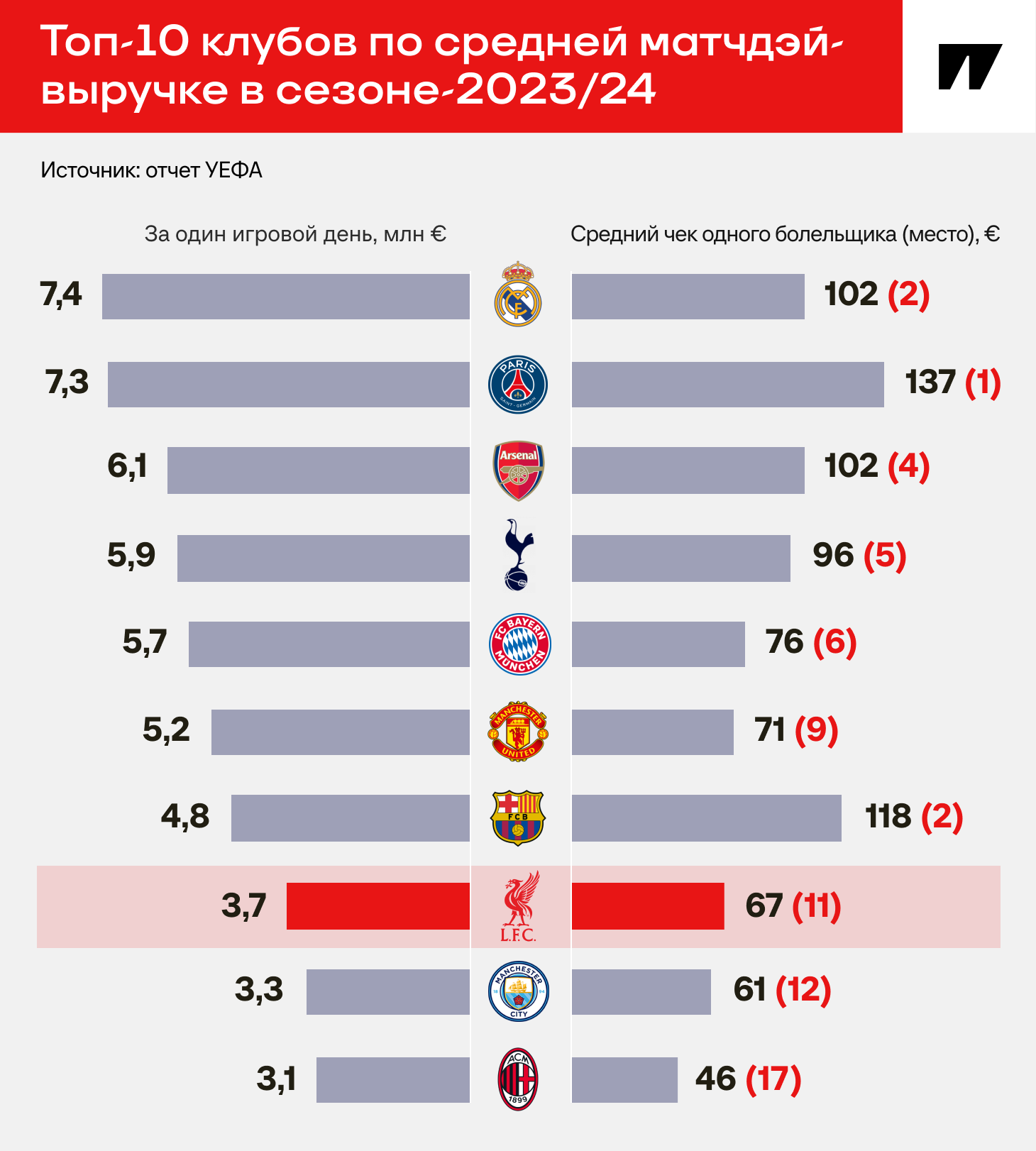 ● Матчдэй «Ливерпуля» не просел даже из-за пропуска ЛЧ в сезоне-2023/24. Тогда продажа абонементов/билетов, а также разнообразные услуги на стадионе в дни матчей принесли в кассу 108 млн евро (годом ранее было 94 млн) – восьмой показатель в Европе. Лидируют «Реал» и «ПСЖ» – 185 и 168 млн соответственно. «Сити» – девятый с 89 млн.