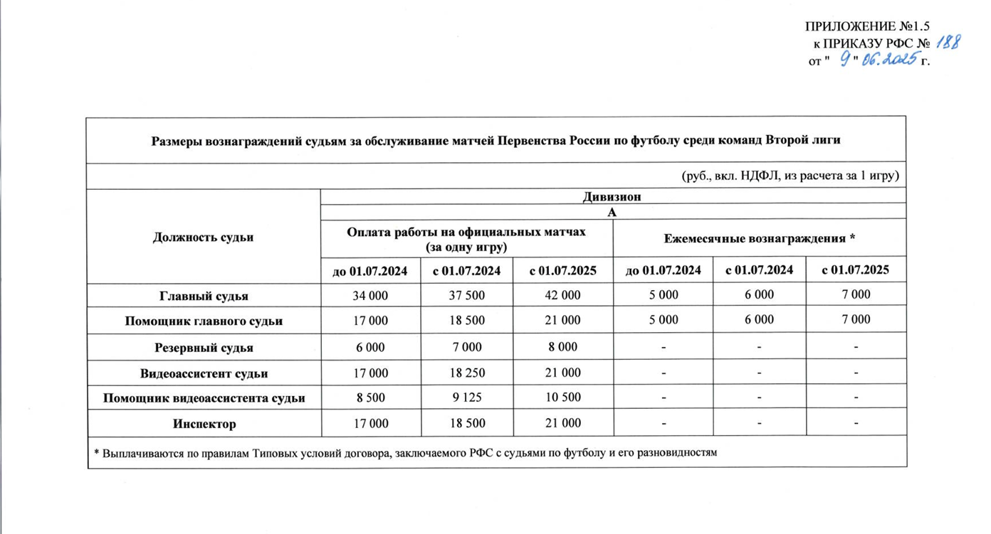 С 01.07.2025 выплаты и вовсе увеличились, хоть и незначительно: главный арбитр будет получать 42 тысячи рублей, помощники и инспектор — 21 тысячу, резервный арбитр — 8 тысяч рублей. К тому же, главный арбитр и его помощники ежемесячно получают вознаграждение в размере 6 тысяч рублей.