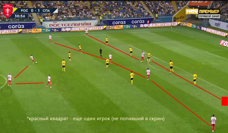 “Ростов”, в свою очередь, имел проблемы в своевременном уплотнении пространств, в силу количественных перегрузов зон от “Спартака”, и в преимуществе, функциональности на флангах — часто приходилось смещаться и больше ориентироваться, не всегда смещения получались слаженными. Сначала у “Спартака” были проблемы, “ростовчане” успевали, а “Спартак” играл более осторожно. После первого пропущенного гола, который повлиял на ход игры и пришел как раз-таки после подключению фулбека с широкой позиции, “красно-белые” стали атаковать активнее, используя большинство в зонах. “Ростов” был менее вариативен в структурах, когда команда Альбы перестраивалась на пять защитников, появлялись преимущества в разыгрывающих зонах у соперника, в четыре — “Спартак” получал больше пространства и, соответственно, вариативности в атаке.
