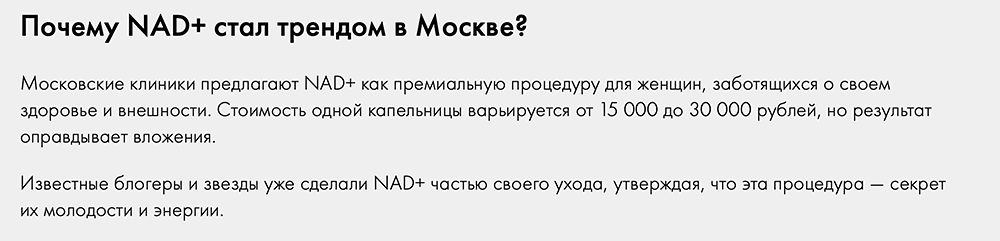 К тому же так и не удалось доказать, что именно низкий уровень NAD+ запускает старение. Скорее, это может быть одним из биологических маркеров возрастных изменений. То есть NAD+ просто снижается с возрастом, а не дает старт цепочке негативных клеточных изменений.