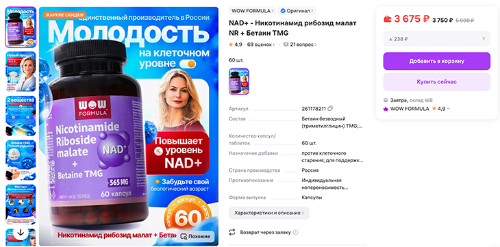 С БАДами все проще – они не относятся к лекарствам, поэтому не обязаны подтверждать эффективность. БАДы с NAD+ свободно продаются на маркетплейсах.