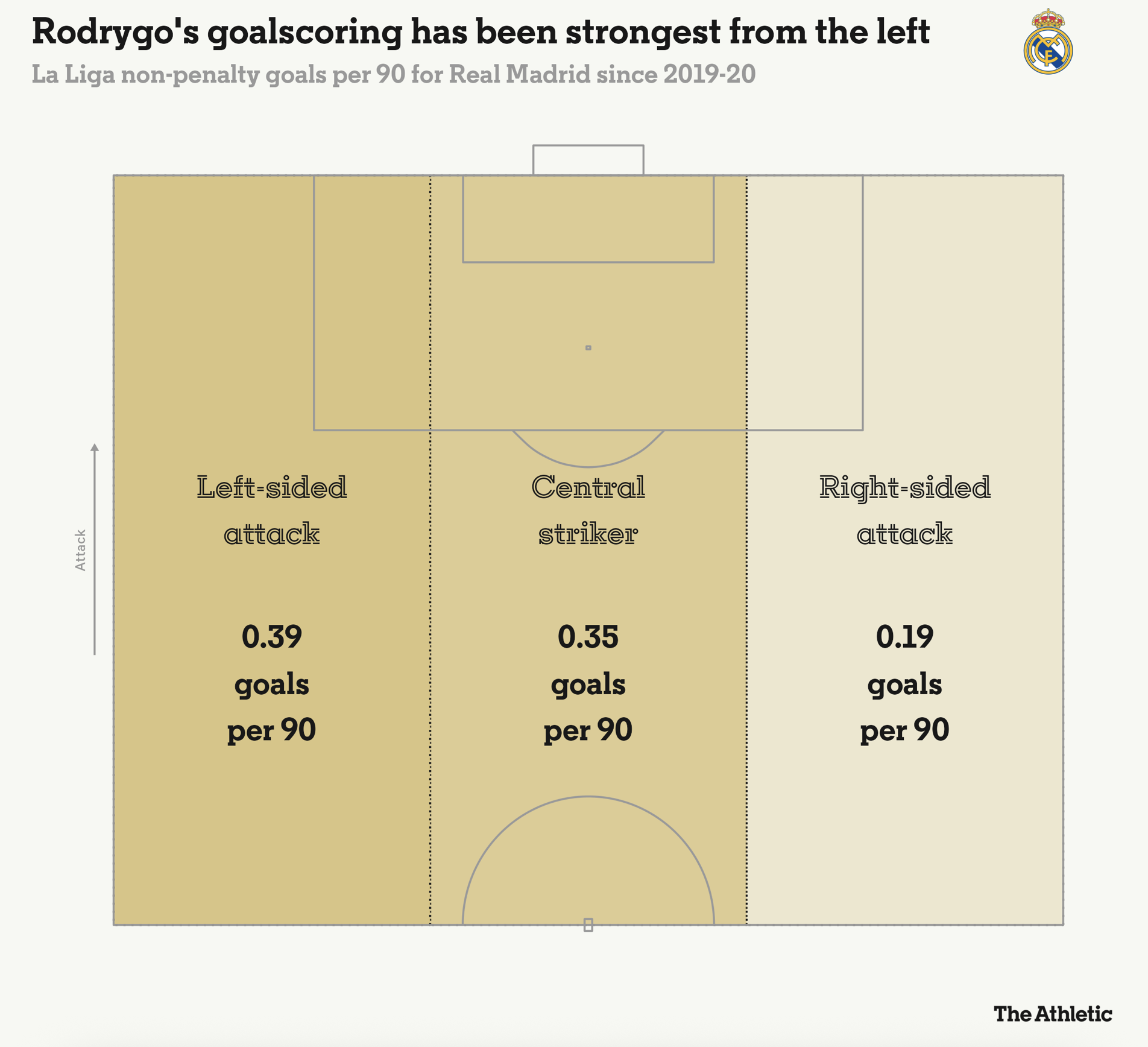 Он не врывается в штрафную со скоростью звука, как Винисиус, и не бьёт из любого положения, как Роналду. Но Родриго чувствует моменты. Он ловит тайминг, появляется в «мягких» зонах, разрезает полузащиту наклонным рывком, уходит в ширину, если надо, и врывается в штрафную, если позволяют.