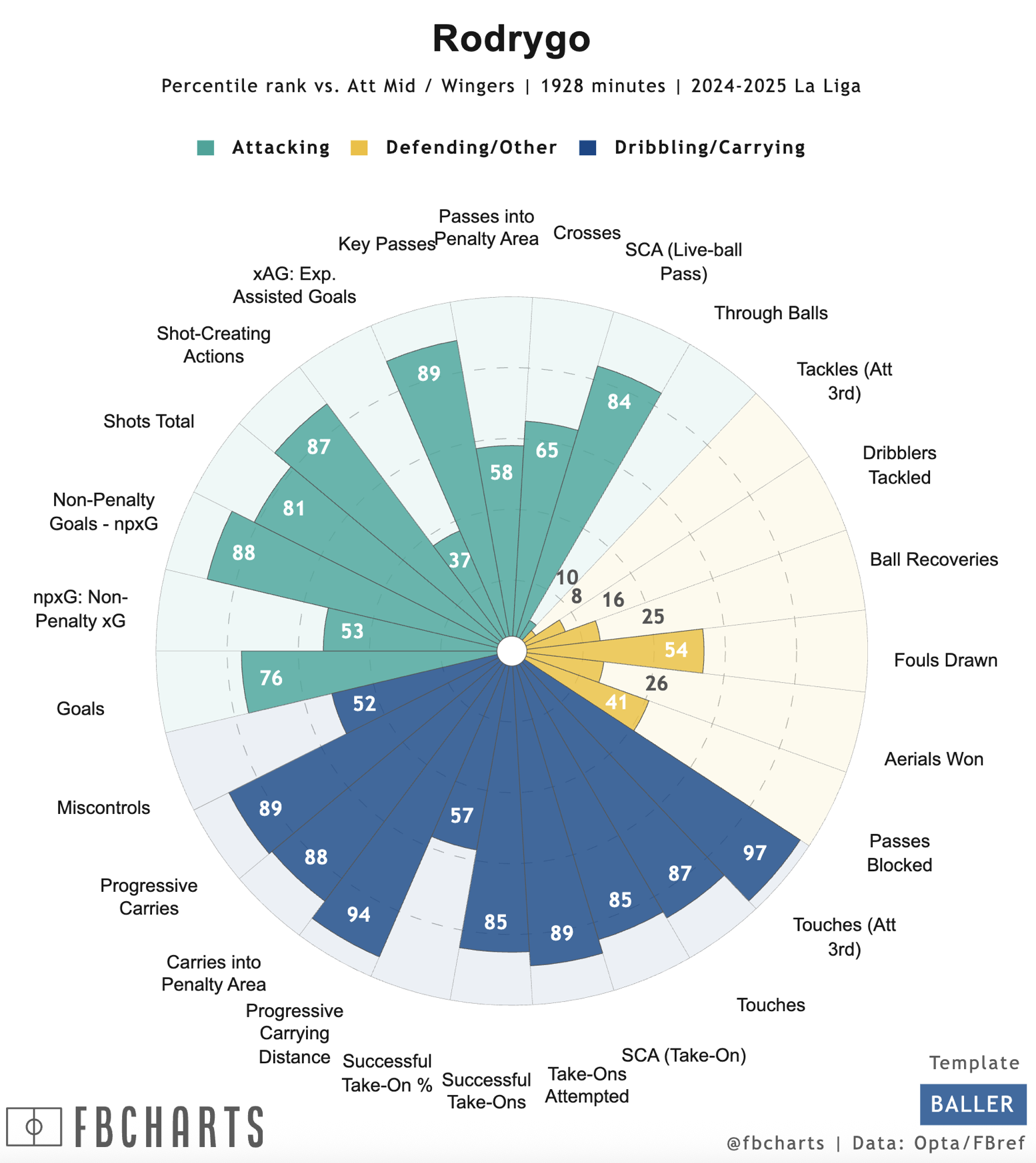 Есть миф, что Родриго нестабилен. Иногда это правда — он может выпадать на пару недель. Но по ощущениям — это не падение формы, а снижение влияния на матч. Он зависим от партнёров, от структуры, от свободы. Дайте ему всё — он даст результат. И это не выдумка: в лучшие недели он выглядит как топ-10 атакующий игрок мира.