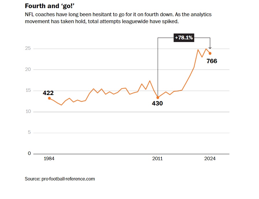 Раньше тренеры в НФЛ редко рисковали и шли на розыгрыш на четвертом даунe. Но с появлением аналитики количество таких попыток по всей лиге заметно выросло.