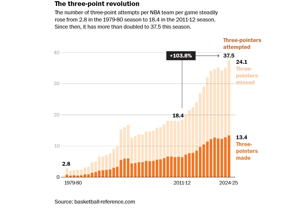 Среднее количество бросков с трехочковой линии за игру на команду в НБА постепенно росло — с 2,8 в сезоне 1979-80 до 18,4 в сезоне 2011-12. С тех пор этот показатель более чем удвоился и достиг 37,5 в нынешнем сезоне.