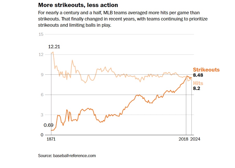 Почти полтора столетия в MLB в среднем за игру было больше хитовых попаданий, чем страйкаутов. Но в последние годы ситуация изменилась: команды все больше ориентируются на страйкауты и уменьшают количество живых розыгрышей.