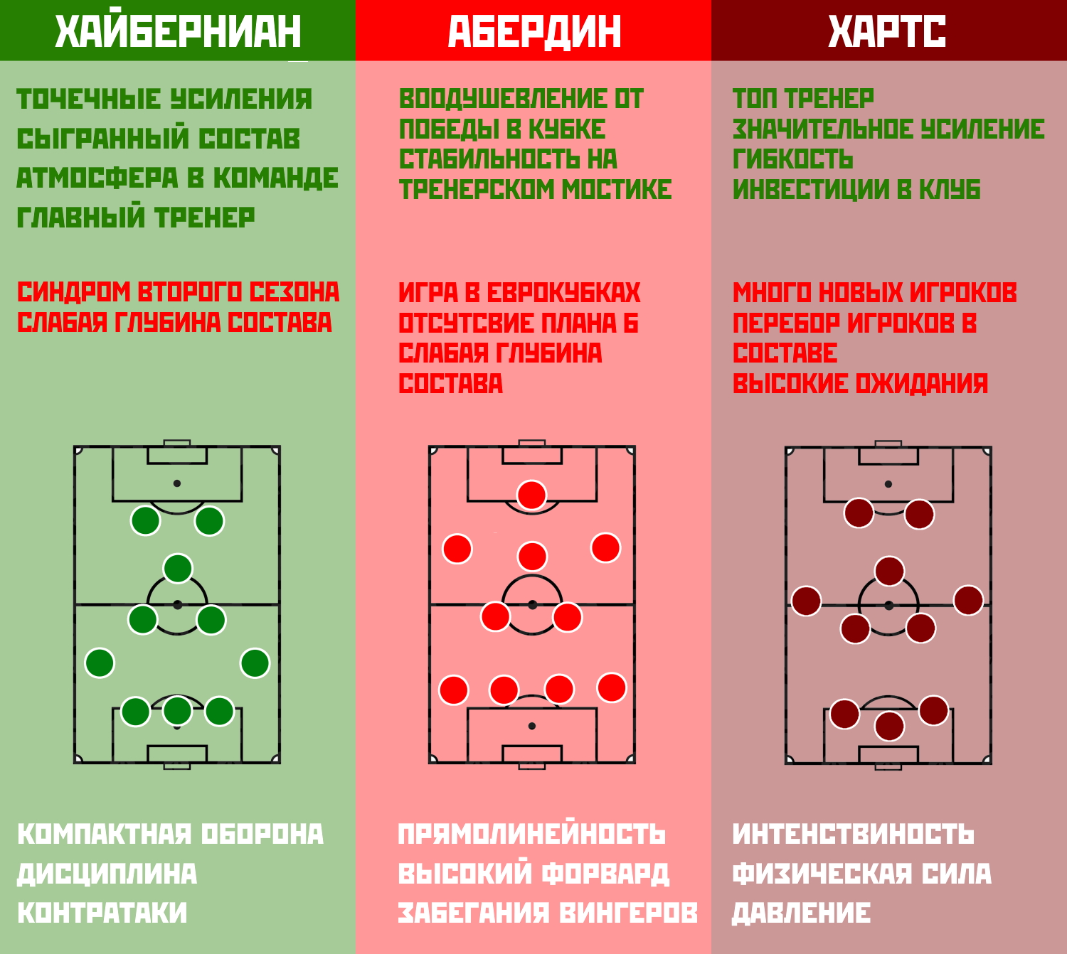 Я давно не припомню, чтобы сразу три клуба реально претендовали на это место. При этом прогнозировать, кто из них какое еврокубковое место займет, крайне сложно. В «Хартс» пришли большие инвестиции Тони Блума, а вместе с тем современные технологии. Клуб значительно обновил состав и подписал лучшего шотландского тренера в рамках Премьершипа. Их соперники по столичному дерби, «Хайберниан», побили свой же трансферный рекорд и стали первой за 26 лет командой не из Глазго, которая выложила за футболиста больше миллиона фунтов. «Абердин» воодушевлен победой в Кубке Шотландии и намерен снова задать жару в лиге – в прошлом сезоне клуб одновременно провел рекордную серию без поражения для тренера-новичка и антирекордную серию без побед.