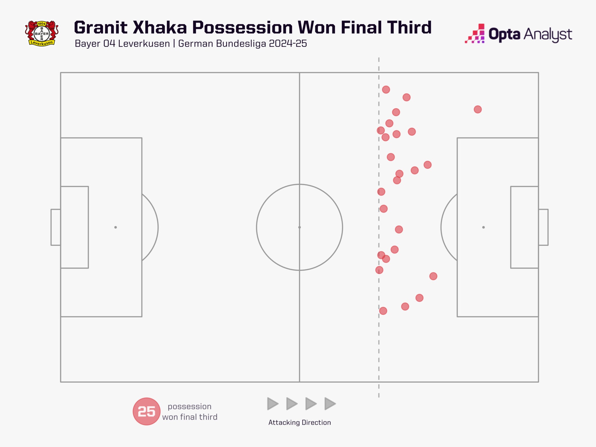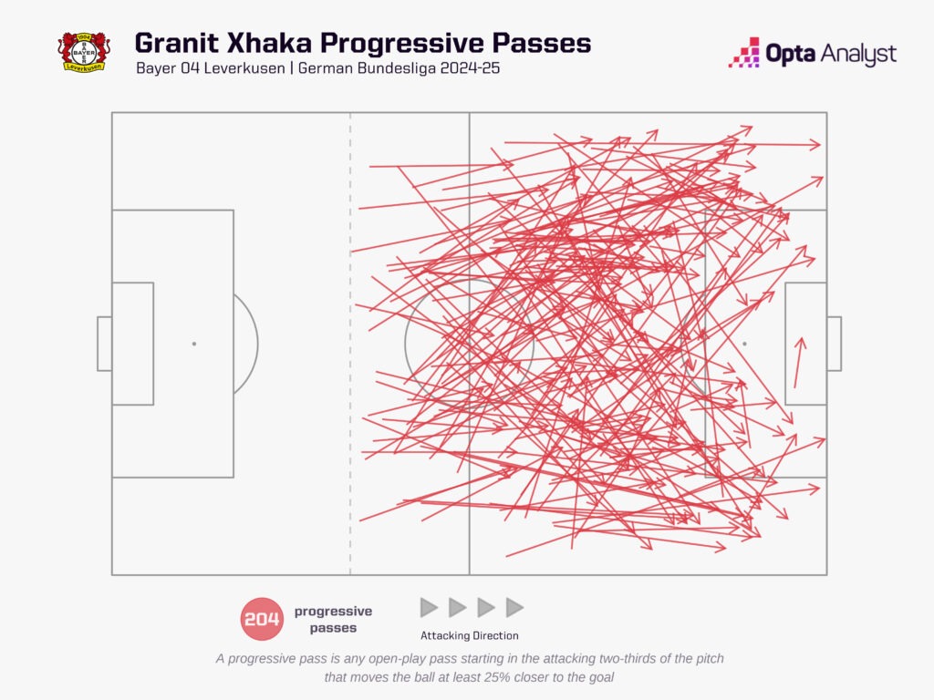 Джака демонстрирует хладнокровие с мячом даже под прессингом, и данные Opta Vision наглядно это подтверждают. Анализируя передачи, выполненные в условиях «интенсивного давления» (когда соперник находится в радиусе 2 метров), его точность составила 90,4% – практически идентичный показатель его общей точности передач (90,7%). При этом он совершил 1 567 передач под таким давлением – больше любого другого игрока Бундеслиги.