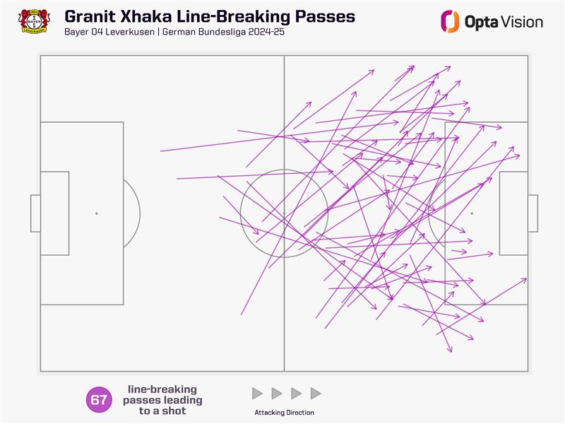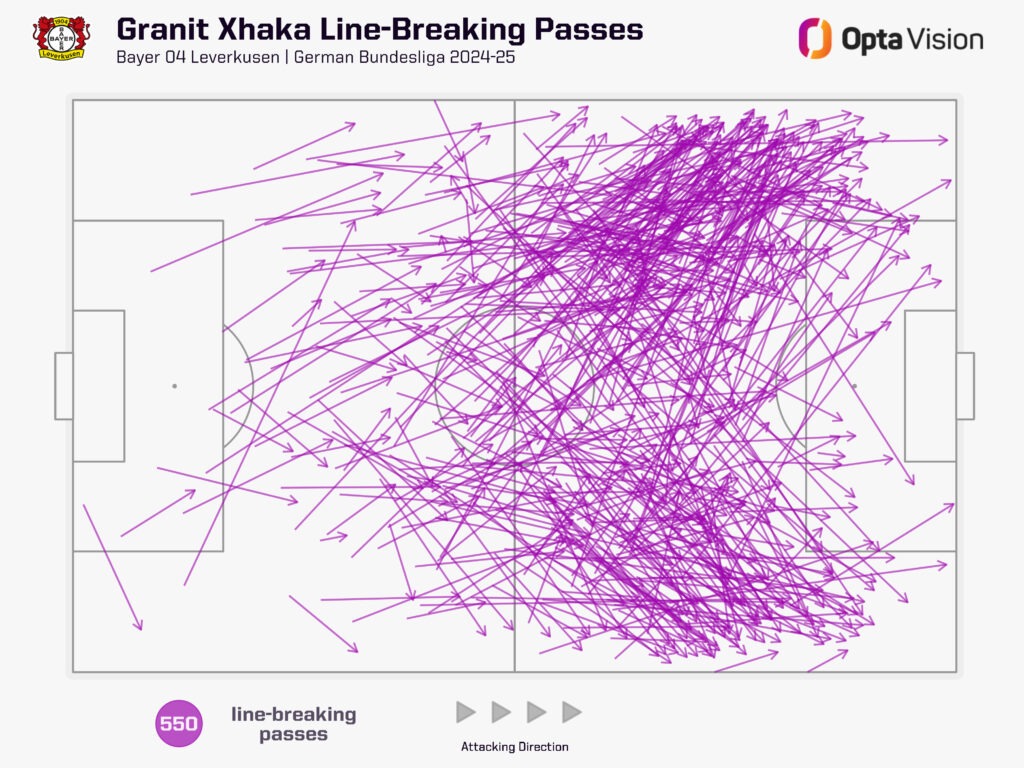 Своим видением поля и мастерством паса он буквально выключает соперников из игры. В сезоне-2024/25 Джака выполнил больше передач, разрывающих линии соперника (550), чем любой другой игрок Бундеслиги.