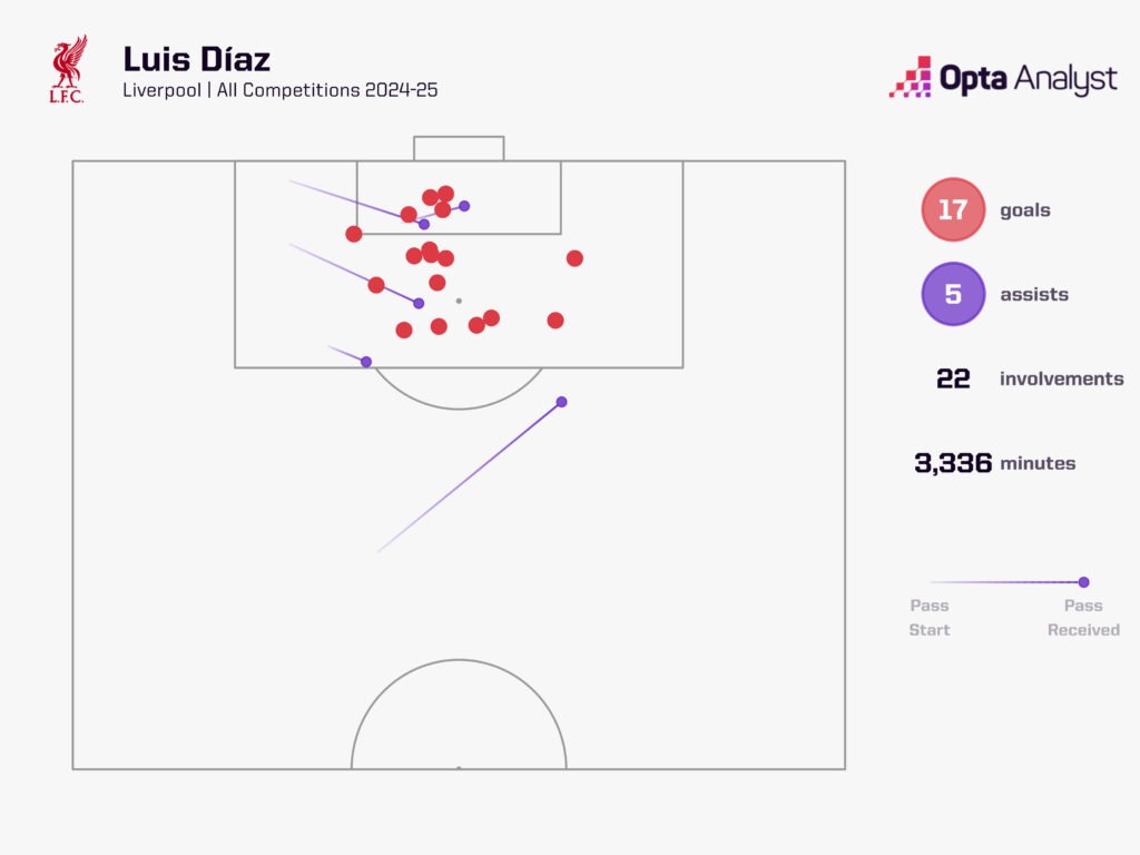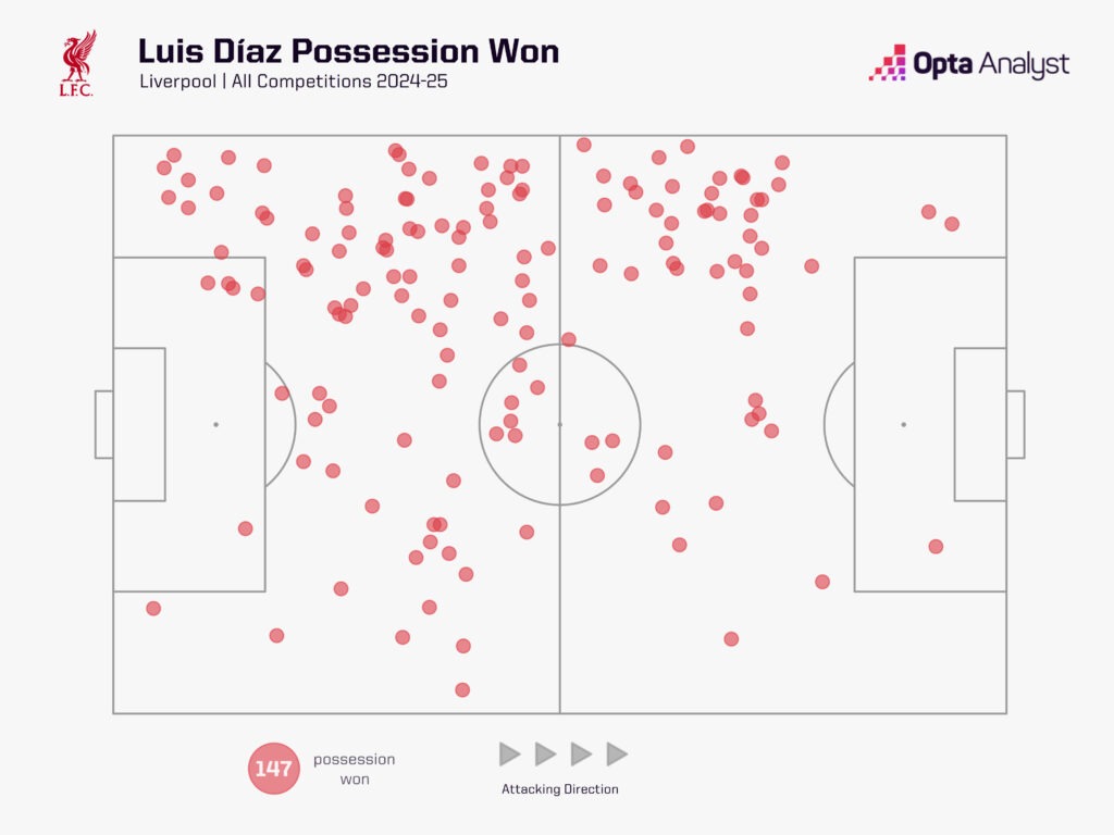 Отдельно стоит отметить оборонительную работу Диаса: в сезоне 2024/25 он отбирал мяч (147 раз) чаще любого другого нападающего «Ливерпуля» во всех турнирах.
