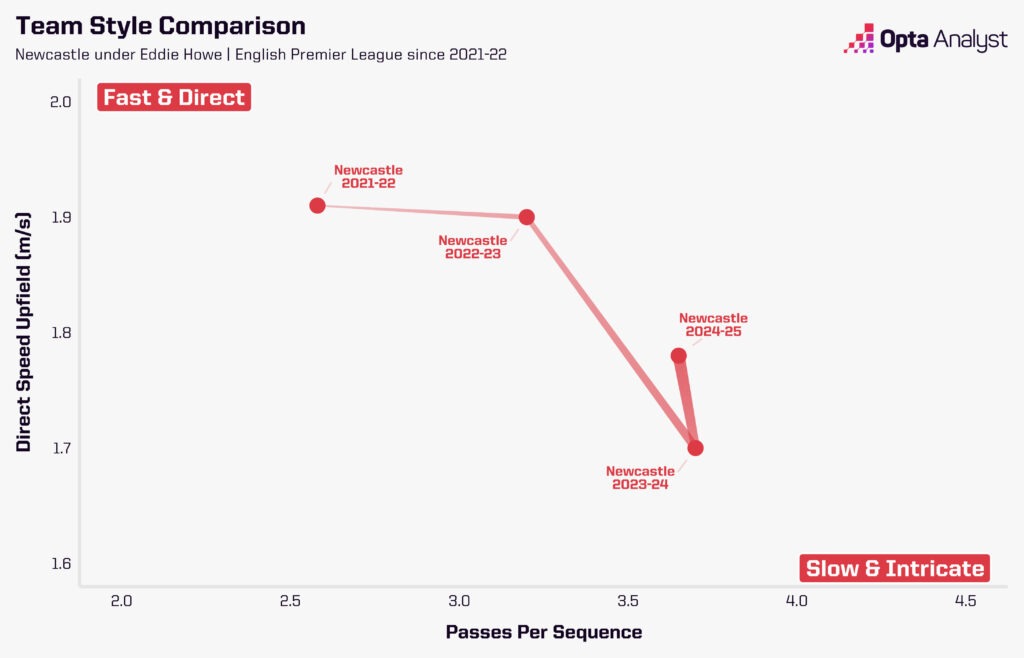 Это соответствует общей эволюции «Ньюкасла» при Хау: команда стала играть более осмысленно и сложно в пасе, что наглядно видно на графике ниже.