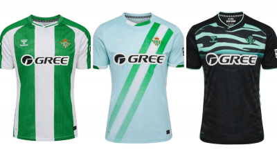 БЕТИС: Hummel использует более широкие полосы на первой форме, вторая форма в светло-голубом цветае Все три формы стоят 84,95 евро.