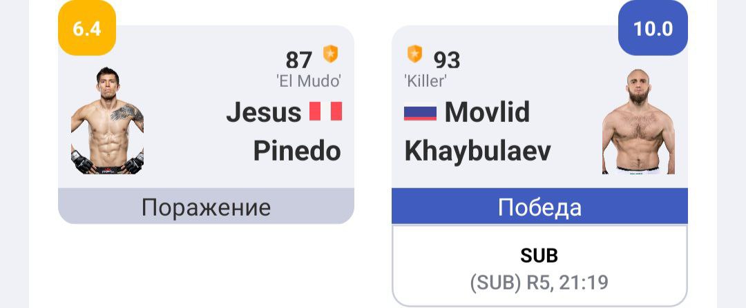 По итогам боя Мовлид Хайбулаев получил оценку 10 за свое выступление от Stats Fight Performance. Эта максимальная оценка, которую получают только бойцы с безупречным выступлением — по технике, контролю и реализации плана. Что касается Пинедо, то он напрочь провалил поединок. Его рейтинг составил лишь 6.4.