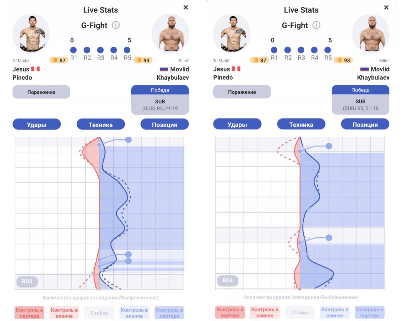Судьи на основе искусственного интеллекта отдают оба раунда россиянину со счетом 10-9. Ознакомится с ИИ-оценками боев всего турнира PFL можно в приложении (доступно в AppStore и Google Play). А экран динамика поединка в приложении Stats Fight лишь подтверждает, что по объему атакующих действий Хайбулаев на голову выше оппонента: