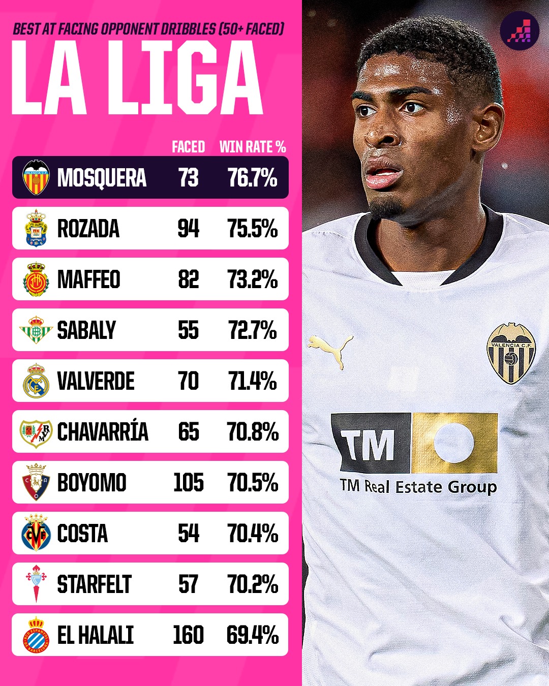 Москера — один из лучших в Европе по игре один в один. Он выигрывает 76.7% единоборств против дриблёров — это топ-1 в Ла Лиге среди игроков с 50+ попытками. Его стиль — «пассивная агрессия»: не кидается бездумно, а чувствует тайминг, отсекает пространство, использует корпус и ноги (причём ноги у него реально длинные, это важно). Его игра в отборе — это микс хладнокровия и взрывной решимости. Причём работает это как на фланге, так и в центре, а иногда и на позиции правого защитника.