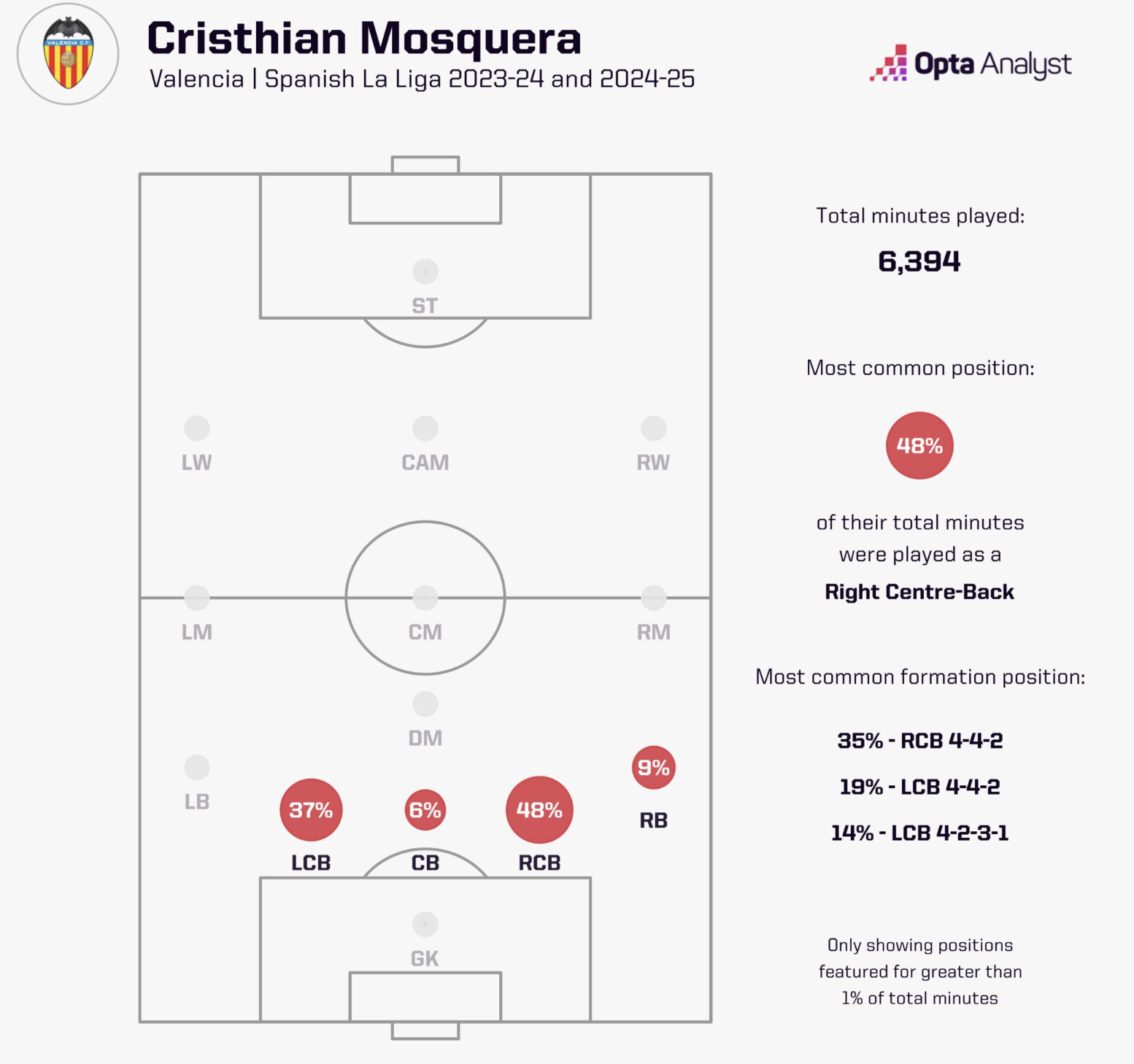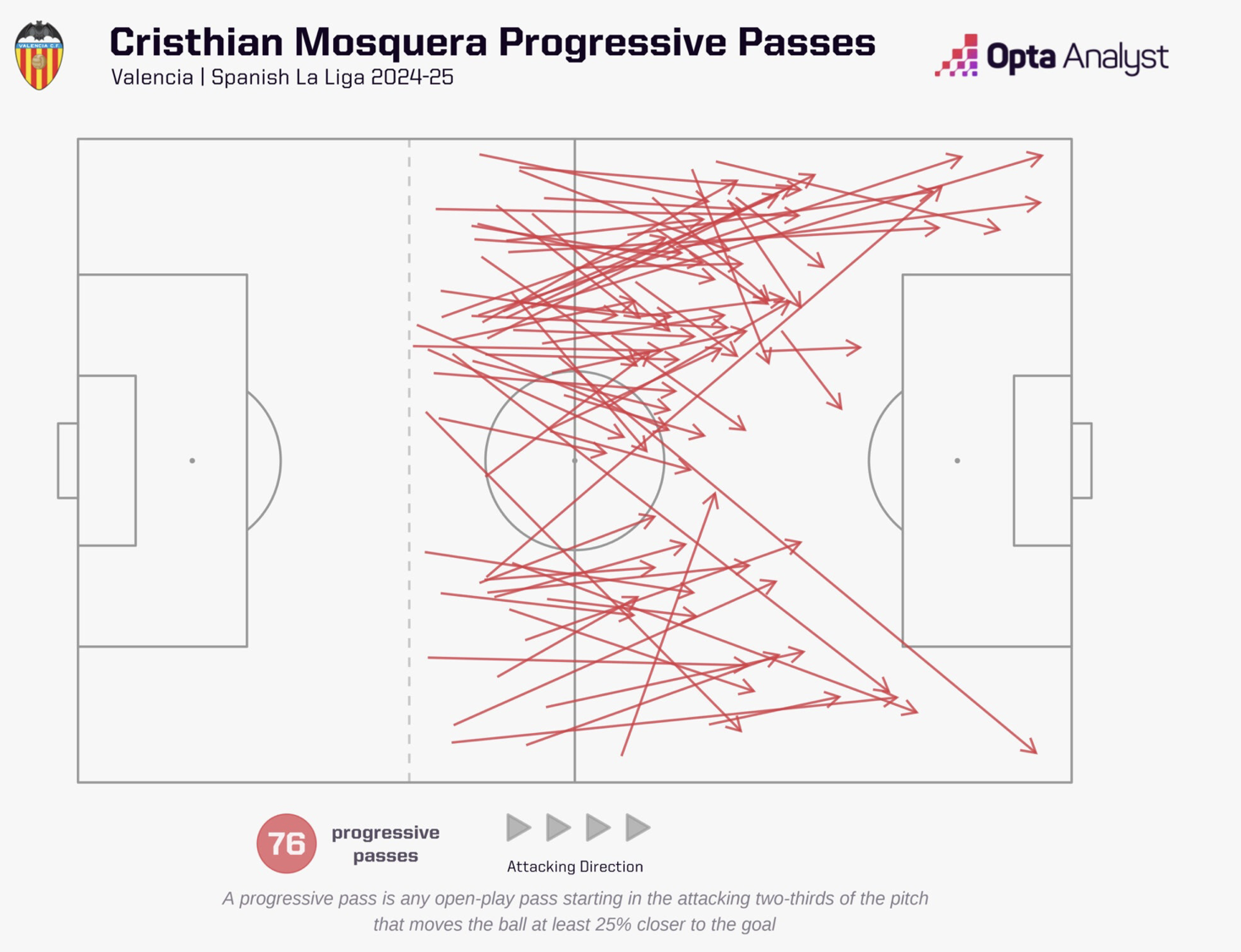 Да, не идеален. Его слабости — в игре головой (всего 51.4% успешных верховых единоборств) и в длинных передачах. Только 3.8% всех его пасов можно считать прогрессирующими, и ни одного ключевого паса за 2000+ передач. Он часто играет безопасно, коротко. Но и тут есть контекст — «Валенсия» не держала мяч, а в «Арсенале» будет рядом с более техническими партнёрами.