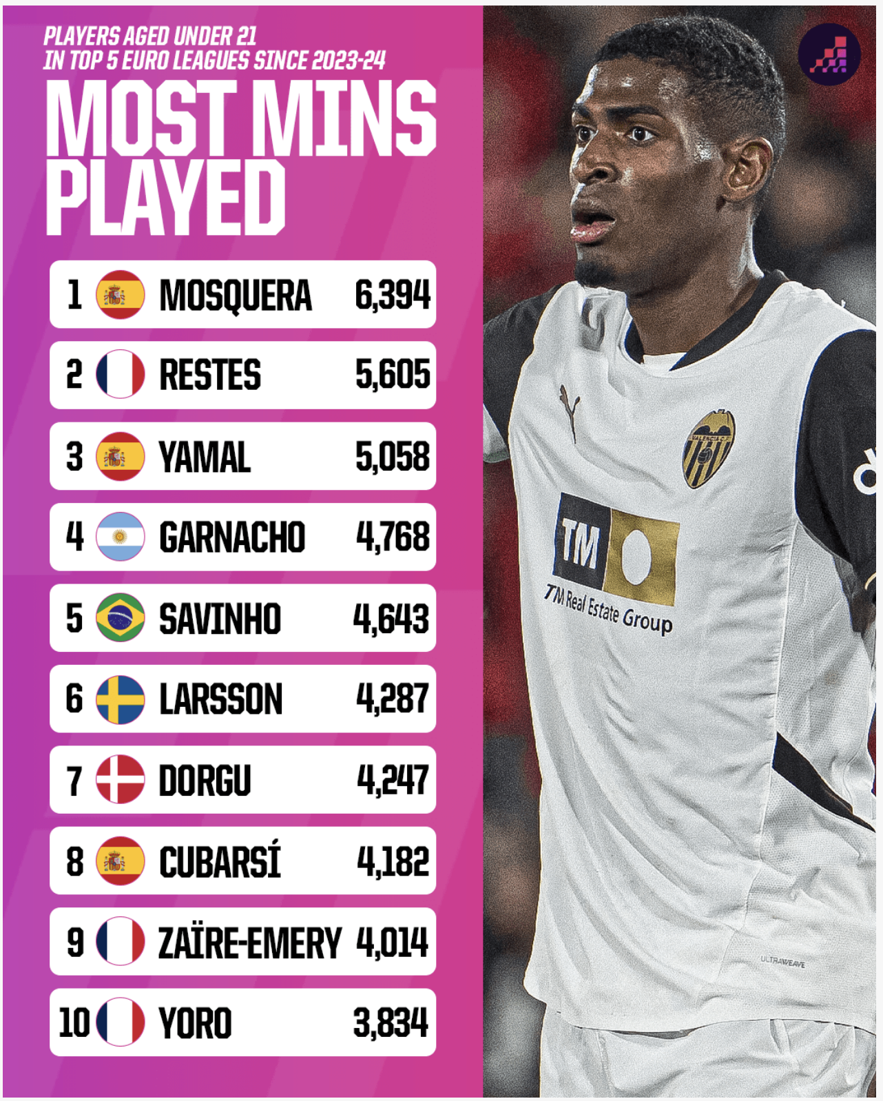 Ему только исполнился 21, а он уже провёл больше матчей в топ-5 лигах, чем любой игрок его возраста. 73 игры за два сезона. 6394 минуты. Только в Ла Лиге у него 74 старта до 21 года — такого не было с времён Лапорта и Азпиликуэты. В составе «Валенсии» он отыграл почти все минуты чемпионата. Единственный матч, который он пропустил, закончился поражением 1:7. Угадайте, кто сыпался без него?