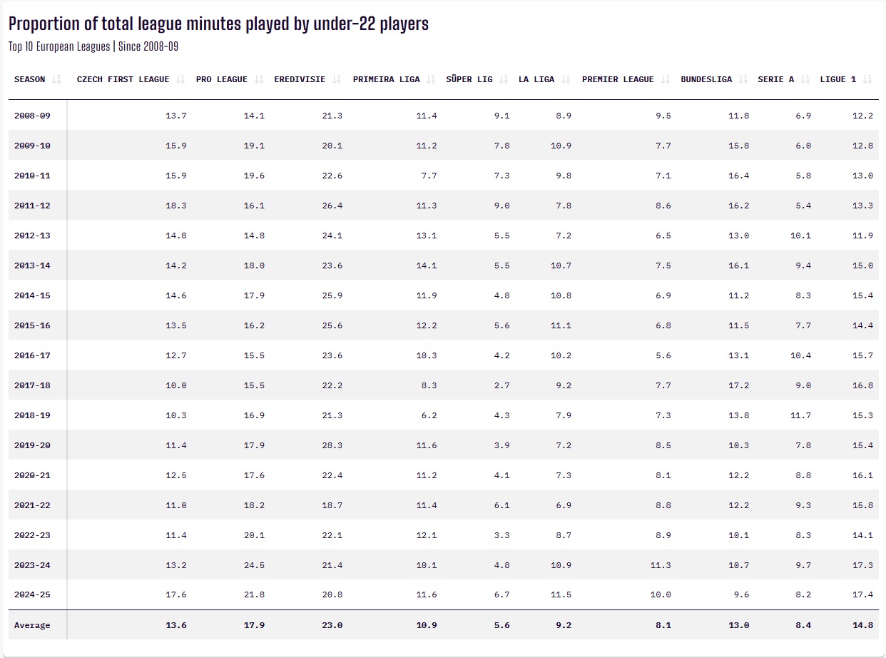 Бельгийская лига идёт по схожему пути, но цифры там скромнее: с 2008 года минимум 14,1% игрового времени у молодёжи. Для сравнения: АПЛ, Ла Лига и Серия А никогда не приближались даже к этому показателю.